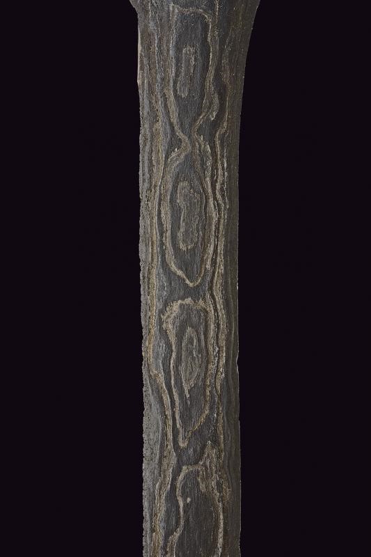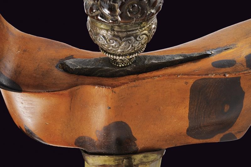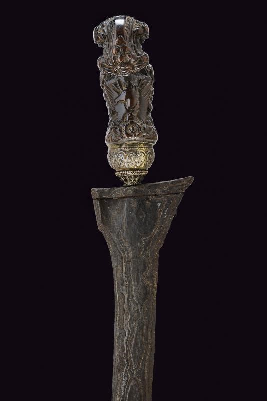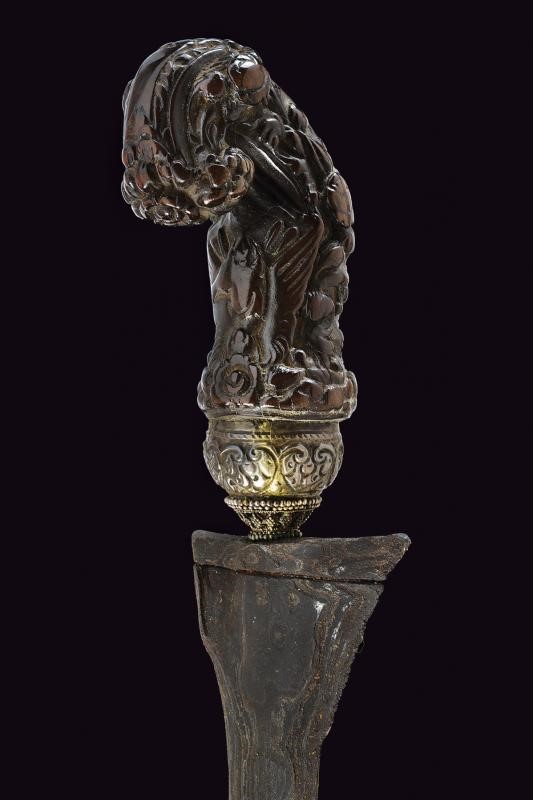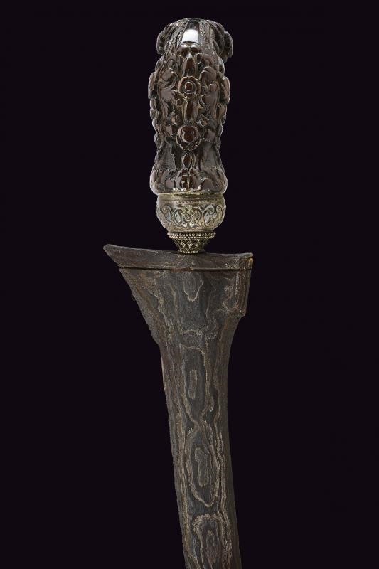 Straight, double-edged blade of lenticular section and made of fine pamor, slightly grooved at the base. Ukiran of richly sculpted wood with winged horse and floral motifs in bas-relief. Mendak of white metal decorated with filigree, selud embossed with floral motifs. Wooden warangka and gandar with smooth brass pendok with heart-shaped hook.