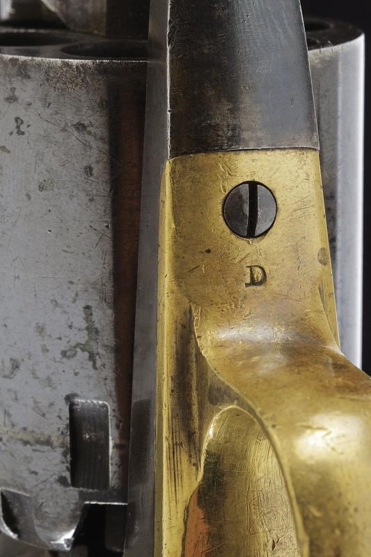 8", octagonal, rifled, 44 cal. barrel, with foresight, featuring at the back the standard three-line mark with inscription “NEW MODEL”, with “D” and “W” marks. Clean bore, visible rifling. Six-shot cylinder marked "R" and "W". Frame marked "R" and "W". Working mechanism. Brass trigger guard marked "D". Numbered "10xxxx" at the grip, barrel with not clearly legible numbers. Retains much of probably earlier browning (70%). The left grip scales with light missing parts and military inspection stamp.