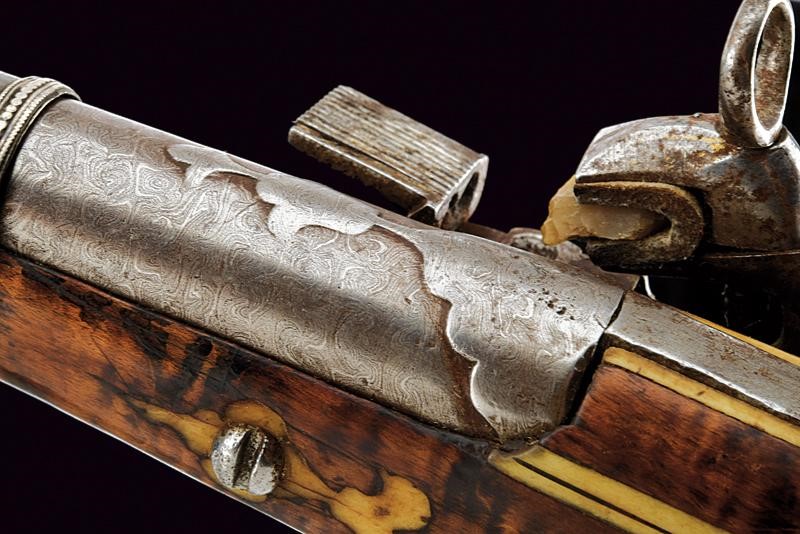 Round, smoothbore, damask barrel with carvings at the base and at the centre, bell-mouthed nozzle. Flintlock with remains of gold decorations. Long wooden stock with walrus ivory butt plate and inlays, with partially-pierced silver mounts featuring beaded bands. Suspension ring. Rare.