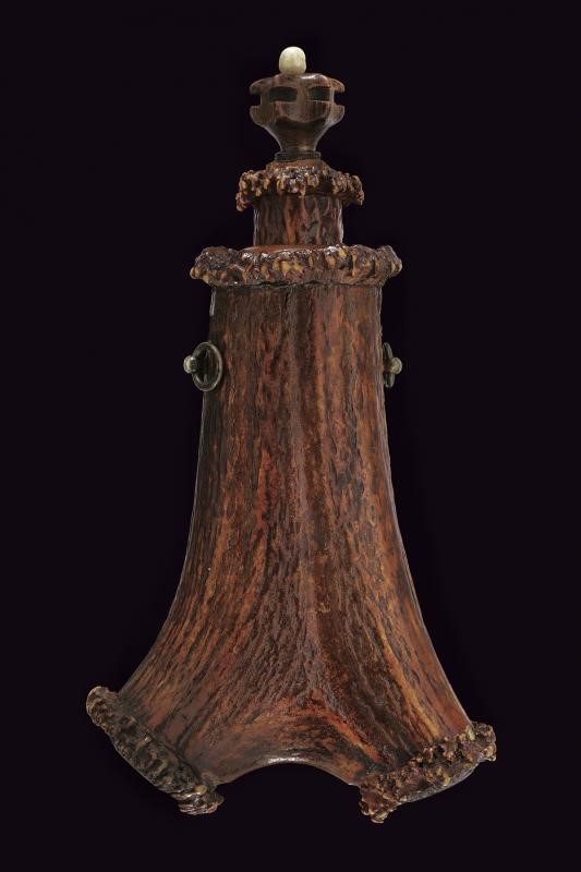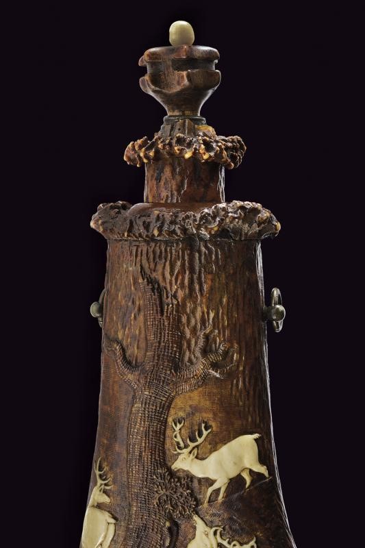 Body made from a deer antler. Finely carved on the front side with stagstalks in stiacciato in a white colour on a brown background. Double, turn-off stopper. Good quality.