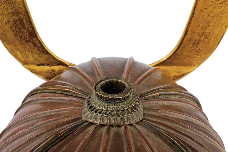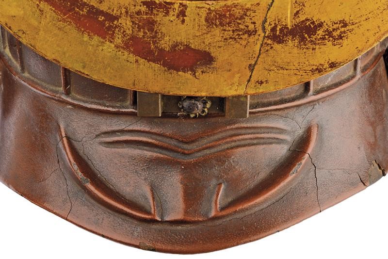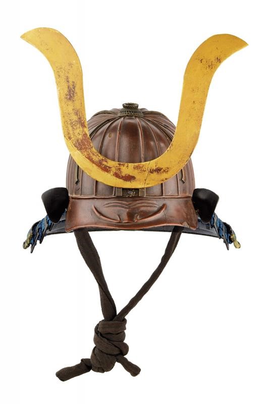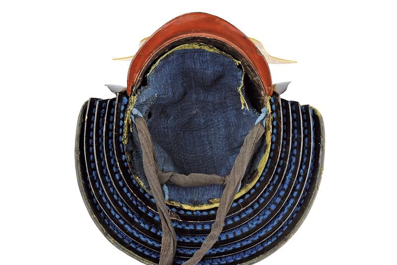 Akoda-nari Hachi consisting of 22 iron plates with rusty finish (missing parts) and shihoujiero decoration. Hachimanza at the top. Mabisashi with decoration in relief, finished inside in red lacquer; double Tsunomoto. Small Fukigaeshi in black lacquer. Four plate Shikoro with navy blue lacing. Interior with Ukebari and Shinobi-no-o. Original Kuwagata maedate in gilded wood. Middle Edo period.