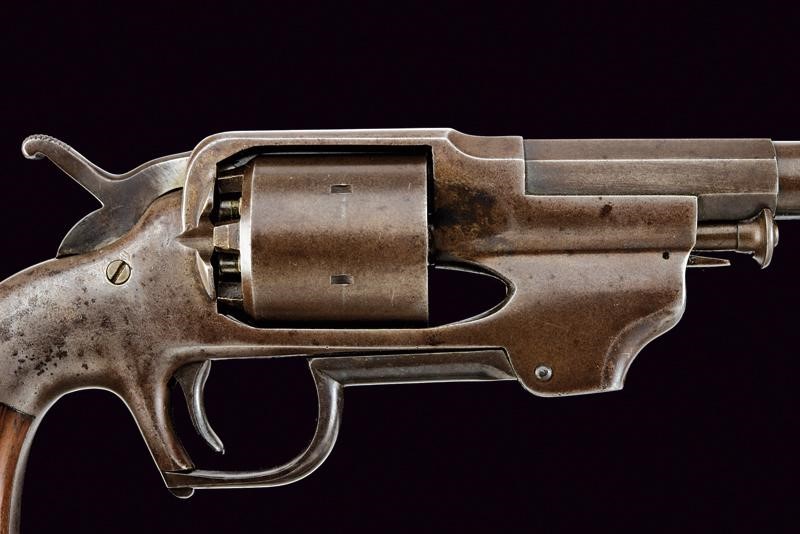 7-1/2", rifled, round, 44 cal. barrel, with octagonal base marked on the side "ALLEN & WHEELOCK WORCHESTER MASS U / ALLEN'S PT'S JAn. 16 DEC. 15 1857 SEPT. 7.", with brass foresight. Clean bore, visible rifling. Smooth, six-shot cylinder. Working mechanism. Cartridge rammer lever at the trigger guard. Some areas with traces of earlier browning. Some areas with light pitting. Wooden grip scales, inside the grip the serial number "3xx" matching the grip scales. Rare.