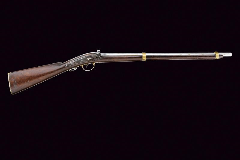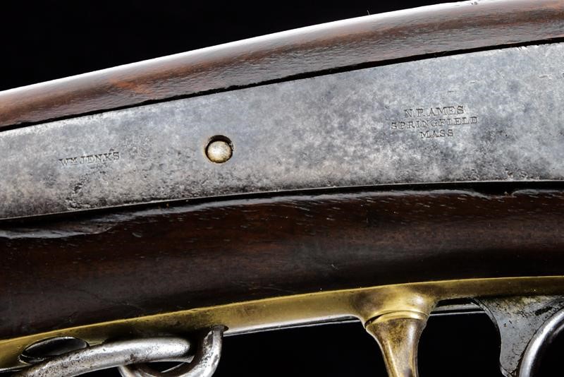 Round, rifled, 54 cal. barrel with square breech marked "USN" on the back and with remains of other markings (not clearly legible). Bore with visible rifling, pitting inside. Sliding bolt with opening lever on the back. Percussion breech-loading mechanism. "Mule Ear" with nipple, rim-fie hammer on one side. Plate marked "W.M. JENKS" and "N.P. AMES SPRINGFIELD MASS.". Working mechanism. Wooden walnut stock (normally it is not provided with the bayonet slot, yet in this case the slot was hollowed out - handcrafted? - and then was filled, probably later, with coloured wax), featuring on the left side remains of two military control stamps. Brass mounts. Butt plate stamped "R".