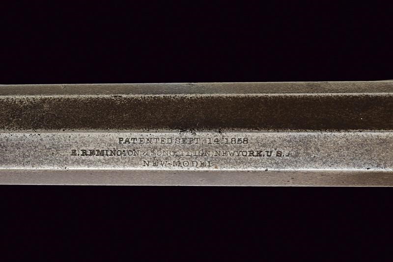 Octagonal, rifled, 8", 44 cal. barrel, provided with foresight, featuring the standard three-line mark “NEW MODEL” on the back, with “J” and “G” marks. Clean bore, visible rifling, some pitting at the centre. Six-shot cylinder marked "S" and "S". Frame with marks "J" and "G". Well working mechanism. Brass trigger guard marked "S". Numbered "14xxxx" on the barrel, different numbers on the grip. Some pitting and remains of earlier browning. Wooden grip scales, the left one with military inspection stamp.