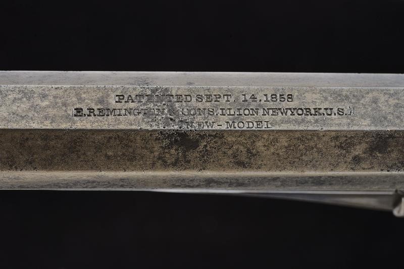 Rifled, octagonal, 36 cal. barrel, with foresight, featuring at the back the standard three-line mark "NEW MODEL". Six-shot cylinder. Well working mechanism. Brass trigger guard stamped "B". Serial number "11Xx" on the barrel. Wooden grip scales.