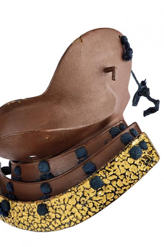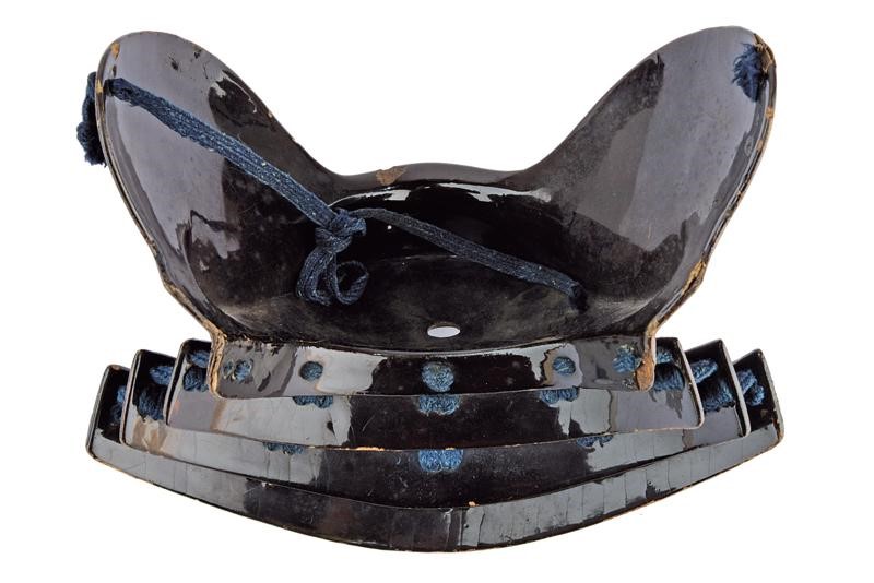 Of tsubame type, black-lacquered inside. Yodare-kake with three iron plates, the first two en suite with the surface of the hanbo, the last one decorated in gold, of tatakinuri type. Early Edo period.