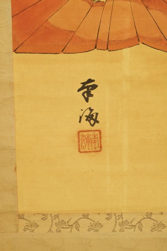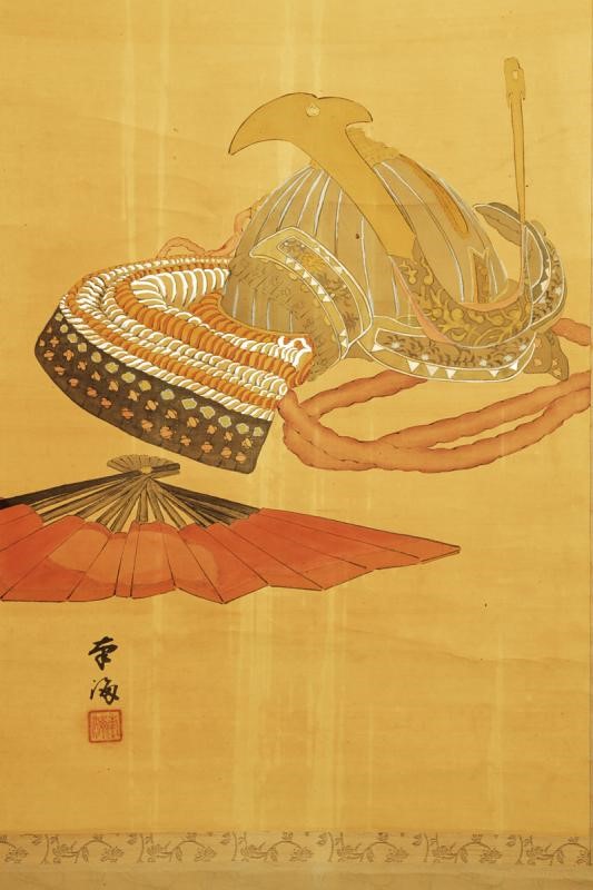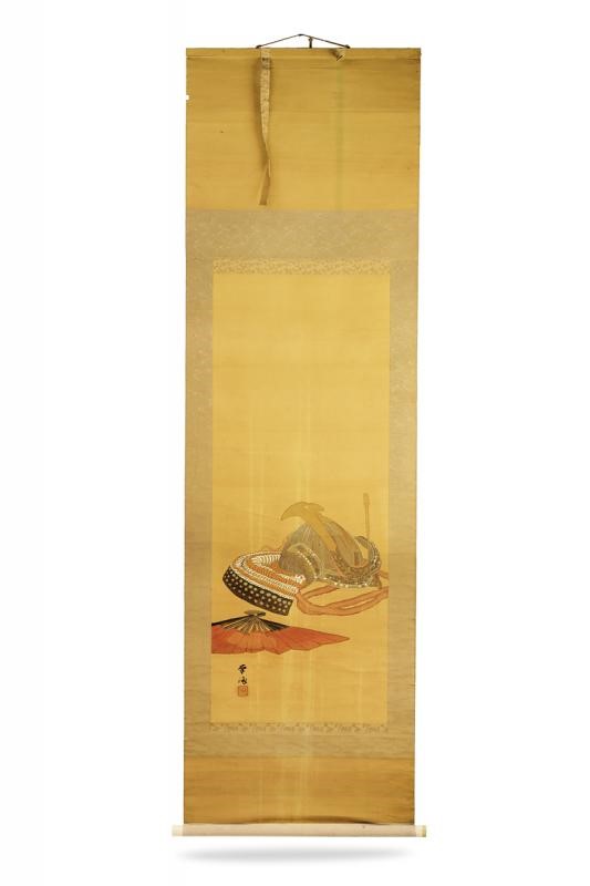 A Kakejiku on silk depicting a Kabuto and a Gunsen (folding military fans). The ends of the scroll made of deer horn. Signed by Toukai.