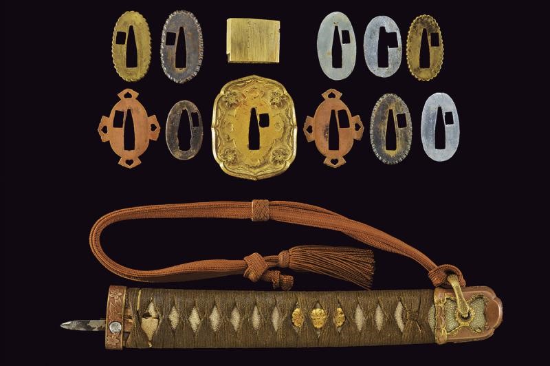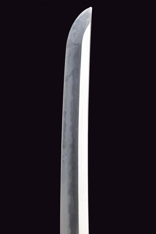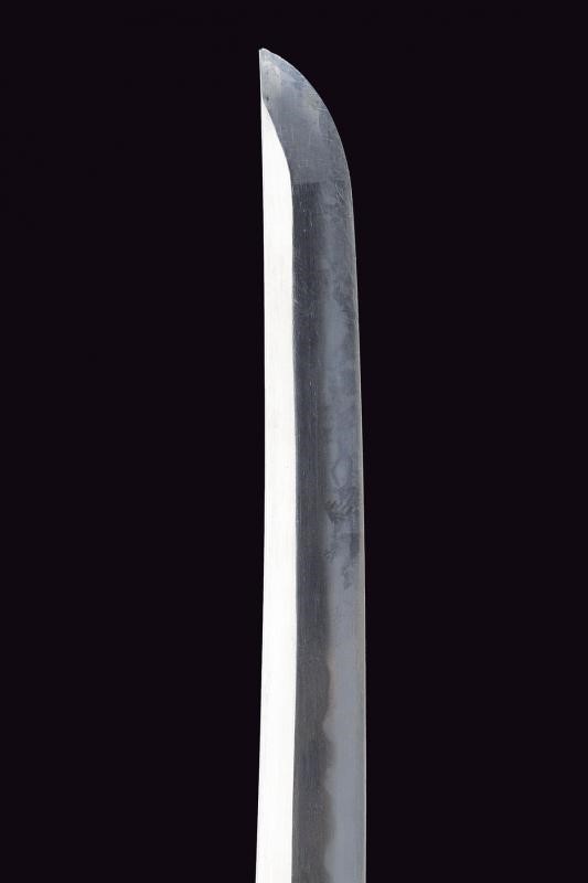 Blade with 64 cm nagasa. Hamon: midare, not visible hada. Nakago with a mekugi-ana (missing mekugi), mei: Noshu Seki Masa Toshi. Brass habaki.Typical shingunto koshirae with chrysanthemum-shaped menuki, tsuka slightly damaged at the base.