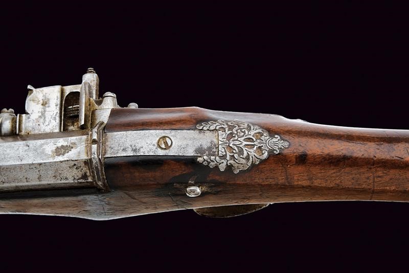 Smoothbore, octagonal, 16 mm cal. barrel, with frame moulded at the nozzle, sight and a crowned mark of St Etienne (?) at the base, with foresight. External wheel lock with frame carved with foliage and pine cones, smooth lock plate, carved spring and cock. Wooden full stock with iron mounts partially pierced and carved with floral motifs. The butt-plate decorated with rays. Iron-tipped wooden ramrod.