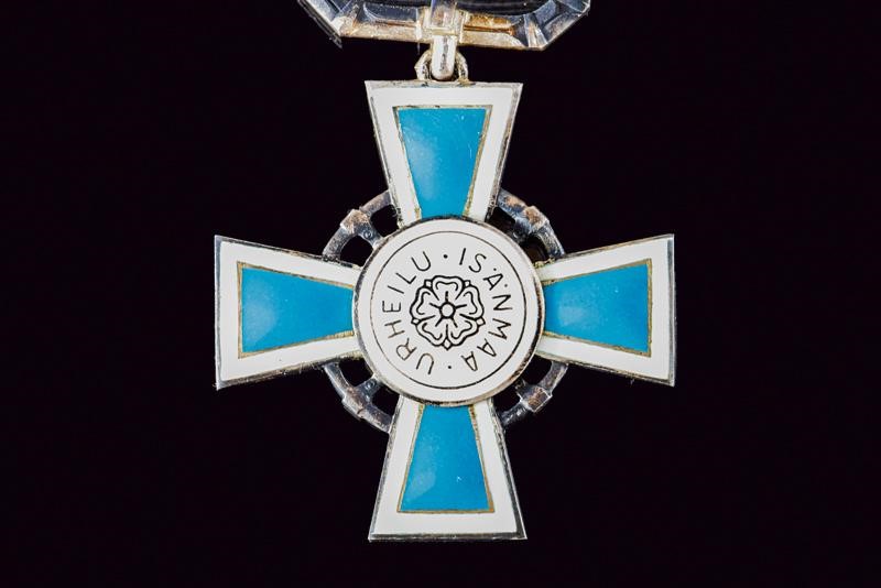 Enameled silver cross; on ribbon.