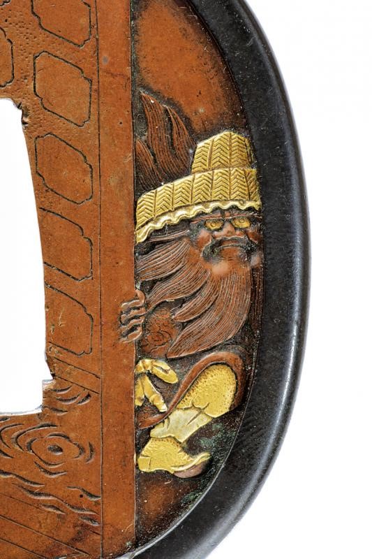 Of tate-maru-gate shape, in shakudo or shibuichi fukurin. On the right side is a partially gold-inlaid old man. Beautiful tsuba of the Tsuchiya school. Kept in a kiri-box.