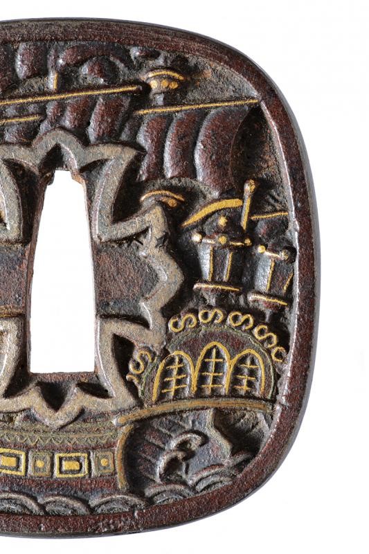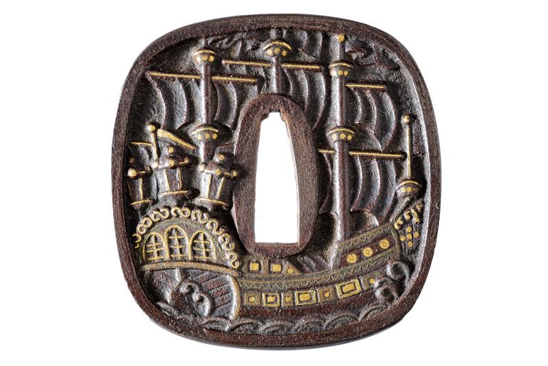 Made of iron, of nade-kaku-gata shape for a katana. With a depiction of a nana-sen (western sailing ship) and with partially gold-inlaid decorations. On one side seppe-dai, on the rar part of tsuba is a rare depiction of a kakure Kirishitan cross (as in the Edo period Christianity was banned as a religion in part of Japan, and in the seppa-dai side the mark is more hidden). Kept in a kiri-box.