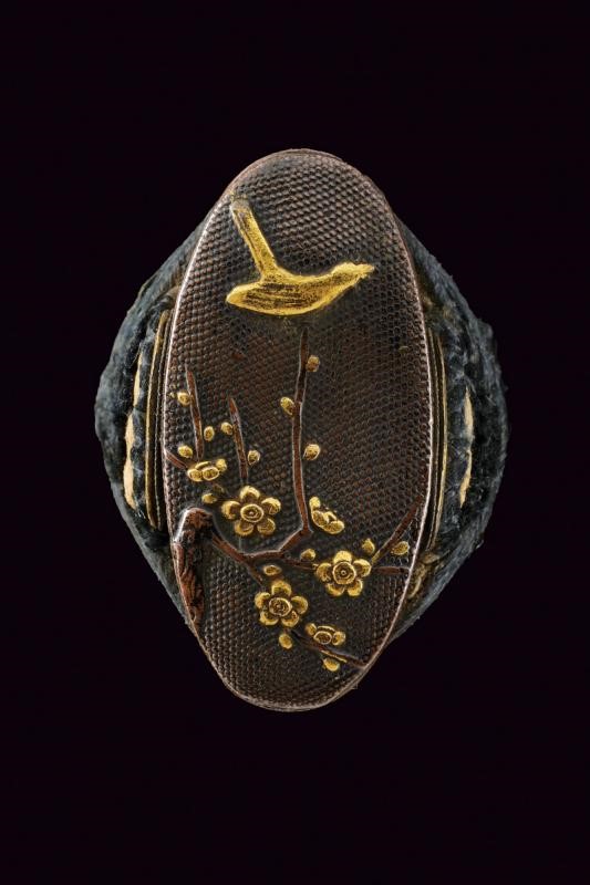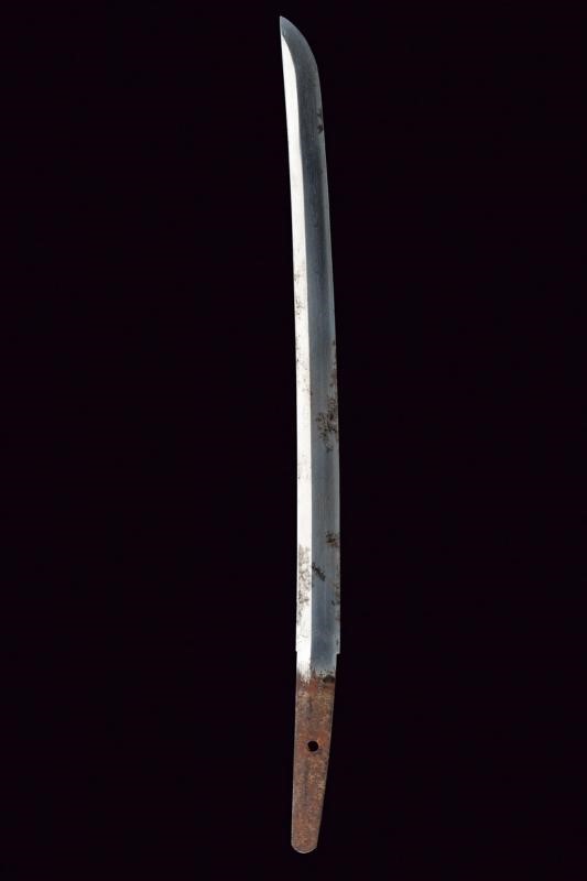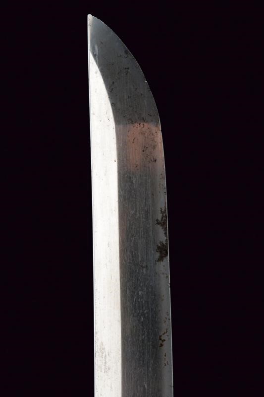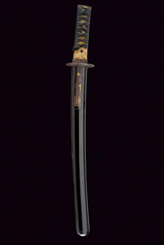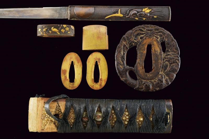 Shinogi zukuri blade (Nagasa 33 cm); hamon: suguha; hardly visible hada; very small pitting at the edge and areas of rust damage on the blade, which can be removed cleaning it. Nakago mumuei with a mekugi-ana. Habaki in gilded copper. Koshirae with iron tsuba carved with floral motifs, beautiful fuchi and kashira in shakudo, with birds and floral decorations reworked in gold and silver, complete with menuki; missing parts of the tsuka-ito. Saya in black lacquered wood (slight missing parts to the finish) with kozuka decorated with an effigy of a deer and partly gilded floral decorations. Early 19th century.