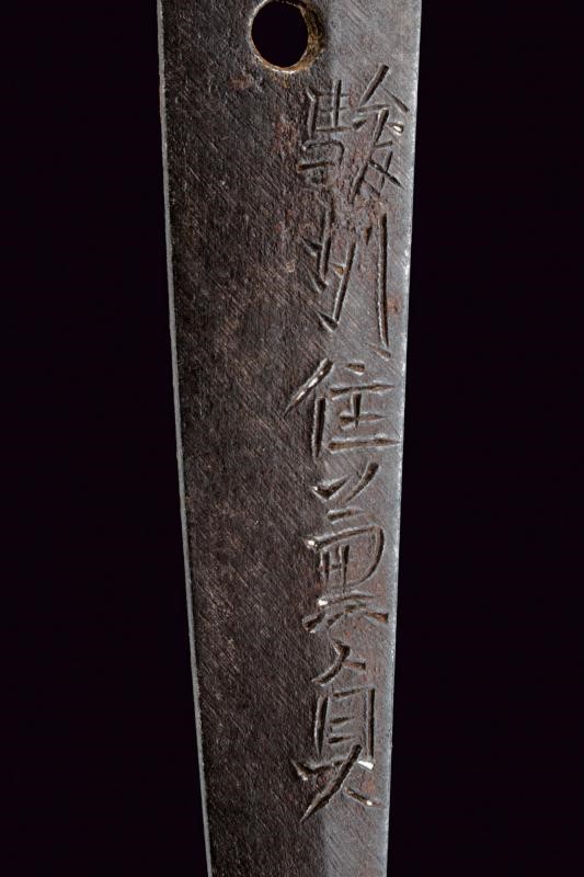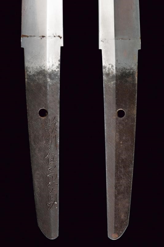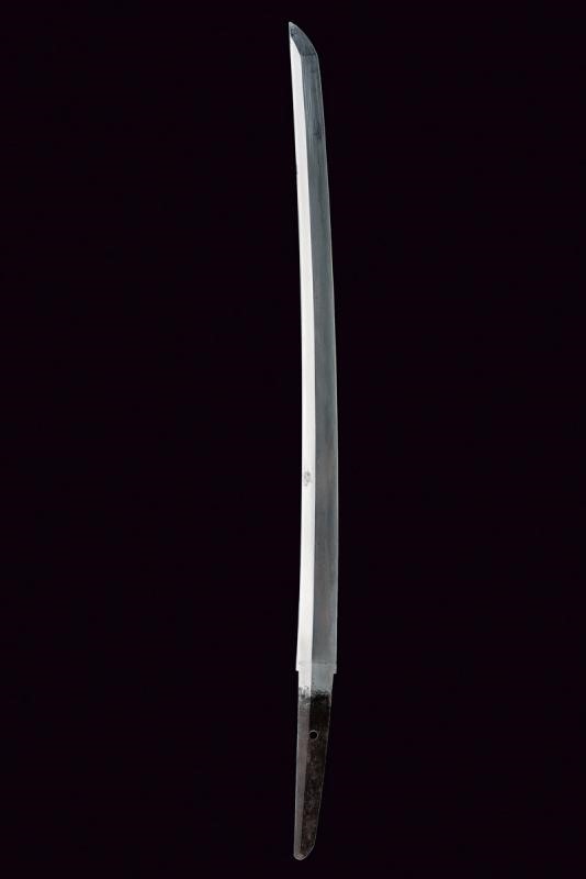Blade (Nagasa of 51 cm) of shinogi zukuri shape; hamon: notare with abundant nie ara nijuba, hada: muji. Nakago mei: Sunshu-Ju-Kanesada Suruga Mino, a mekugi-ana. Double habaki made of partially gilded copper. Interesting koshirae, iron tsuba in maru-gata form with aubergine sukashi, the rest decorated with weave; fuchi and kashira in copper decorated with silver weave and dots; menuki in shakudo with birds in gold. Saya of black lacquered wood, iron kozuka decorated with floral motifs in gold, silver and shakudo. Kanbun Shinto period, 1661.