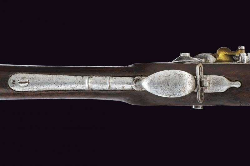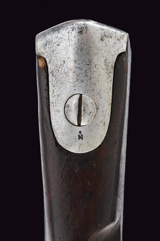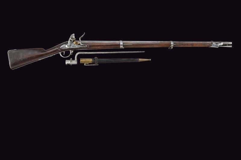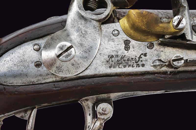 Smoothbore, round, 17 mm cal. barrel, square at the base marked "B.no", "C.P" and with remains of other markings, clutch for the bayonet, foresight on the mouthpiece; tang with model markings. Flintlock marked "R.a Manif.a di Torino" and with Piedmontese marking; brass pan. Wooden full stock (small defects and cracks), on the right side stamp with Savoy shield. Iron mounts and ramrod. Bayonet with blade of triangular section (length: 48 cm), leather scabbard with brass mounts.