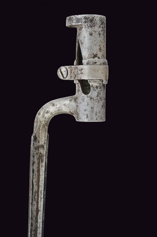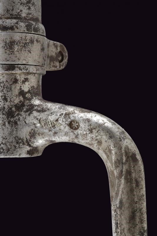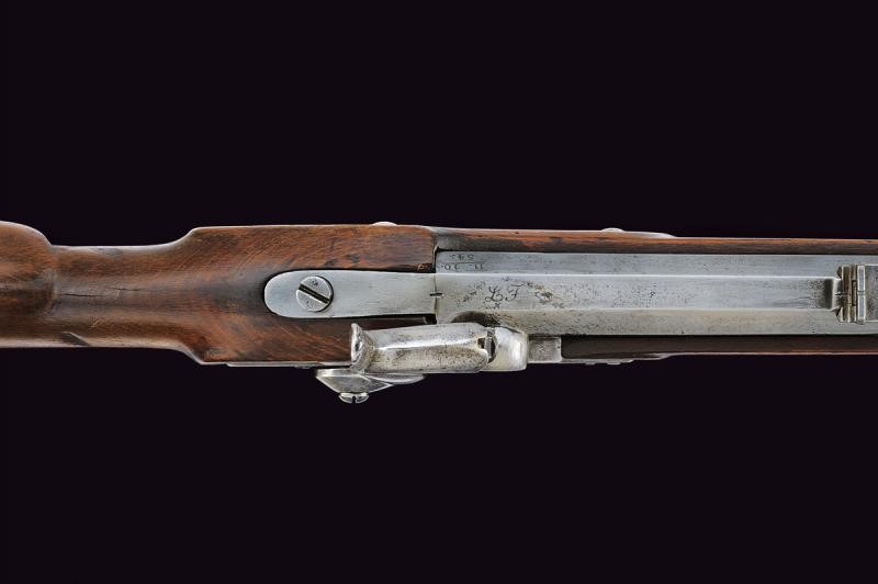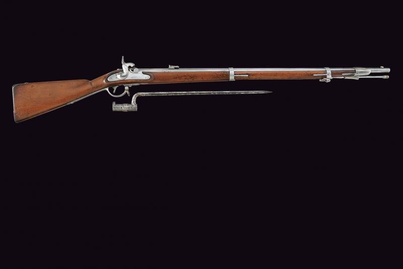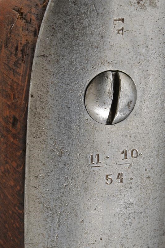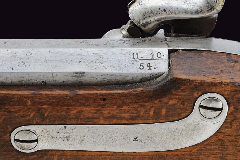 Round, rifled, 13,9 mm cal. barrel, (bore with pitting, visible rifling), with octagonal base marked "LK(H?)", "11. 10. 54." and with various marks on both sides, foldaway rear sight and foresight. Forward spring lock dated "855" and featuring imperial mark. Wooden, full stock with mounts, ramrod and iron socket bayonet (length 56.4 cm).