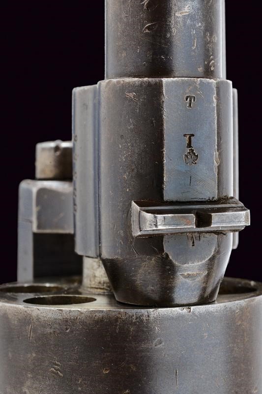 Rifled, cylindrical, 11 mm cal. barrel (clean bore, clearly visible rifling), provided with foresight and fore-end, the base with “T” marks, double eagle. Smooth, six-shot cylinder. Working mechanism. Frame marked “14 TD 256” (probably department numbers) and with serial number “23xxx”. Grip with checkered wooden grip scales. Ring for the strap. (Re-blued?).