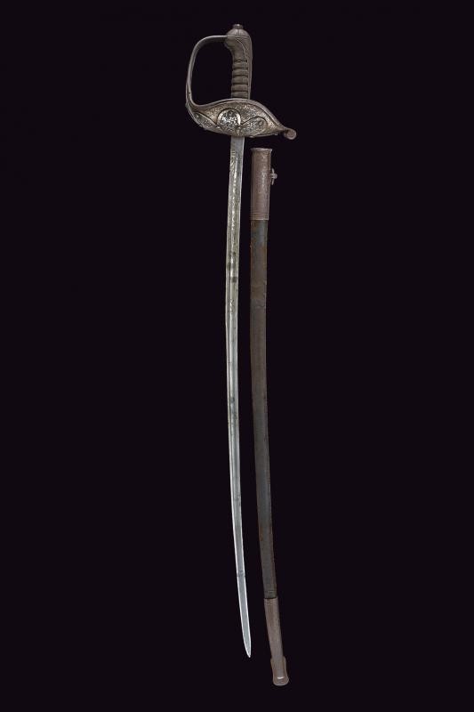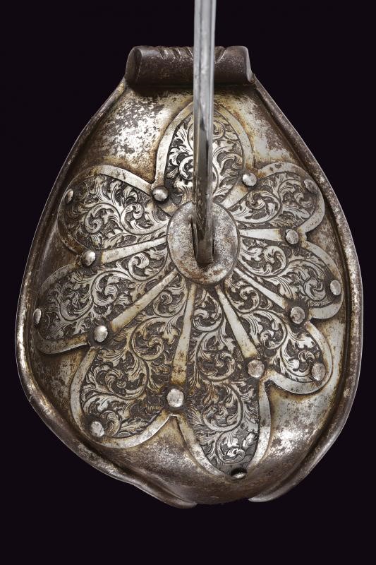 Thin, tipped, single-and short false-edged blade, with fuller over three quarters of the length, engraved at the forte on both sides, featuring on the right side a trophy of shields and lances, on the left side the signature "GIORDANI NAPOLI". Stamp "S&A." on the tang. Iron hilt with large one-piece guard with butt-plate, this one also reinforced by an iron plate engraved with racemes. Leather-covered grip with brass wire binding. Long, partially checkered cap. Blade in good condition, the hilt with a little patina which can be easily cleaned. Matching leather scabbard (damaged and worn) with iron mounts with one lug.