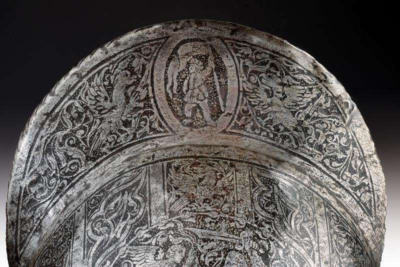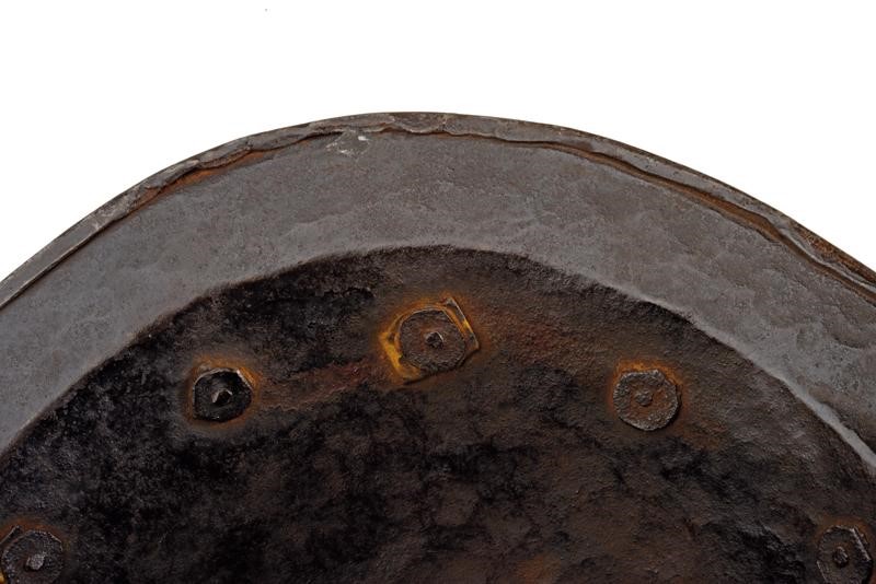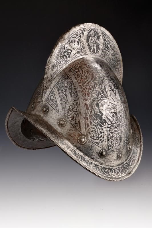 Iron skull worked in one piece with the brim. With a medium-high comb featuring a twisted edge at the top; sloping, pointed and ribbed brim with hemmed and twisted edge. The entire surface finely etched; on one side is a scene depicting the Biblical scene of the 'Sacrifice of Isaac' inside a round frame surrounded by birds and floral motifs on a granulated ground; on the other side is a knight on horseback decorated en suite. The comb with a depiction of a drummer and a standard bearer, both inside an ellipsis among birds. The base with a row of rivets provided with iron rosette (small missing parts). Flaking and remains of leather strings inside.
