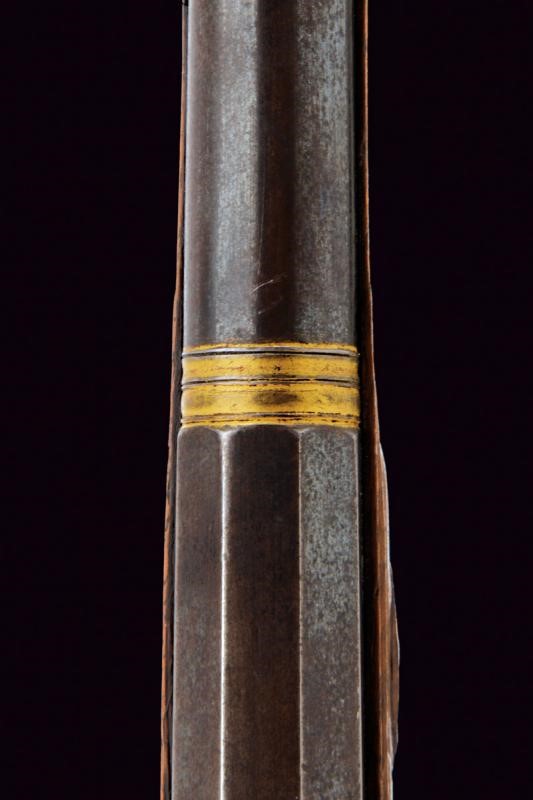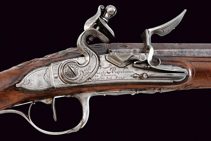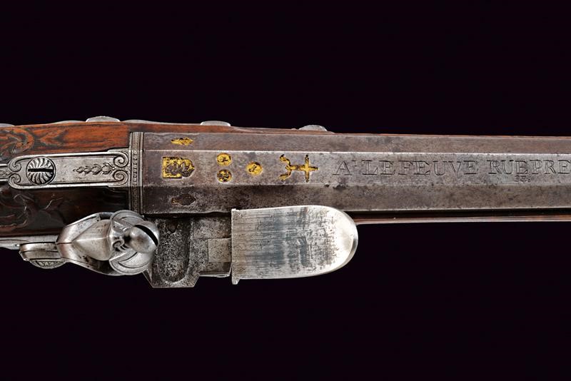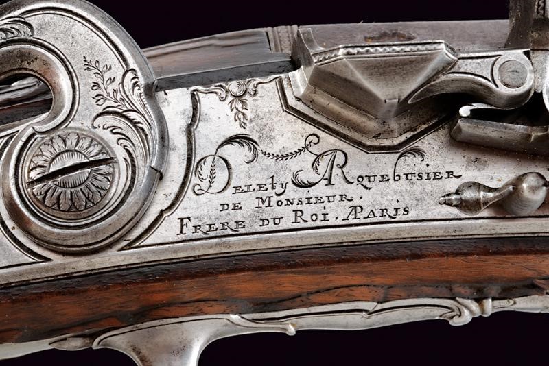 Smoothbore, browned, two-stage, 15 mm cal. barrel, octagonal the first part with frame at the base, deep gold mark between lilies and under a cross (also gold-inlaid, missing parts), later inscription "A LE FEUVE RUE (DES) PRE CHEUS", then round after two gold-plated rings, swallowtailed foresight. Tang with beautiful engravings. Finely carved screw, like all other screws). Elegant flintlock signed "DELETY ARQUEBUSIER DE MONSIEUR FRERE DU ROI. A PARIS" (Delety used this signature around 1785); the frame and cock decorated like the tang. Wooden full stock (a cracked part on a right side of the barrel), partially sculpted with floral motifs with long graceful grip. Steel mounts finely carved and engraved with geometric and floral motifs. The back of the butt with a cushion covered with leather and fixed with small brass nails. Horn ramrod (missing parts) provided with iron cartridge extractors.