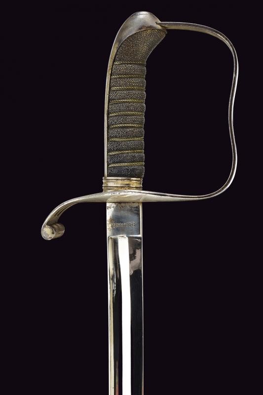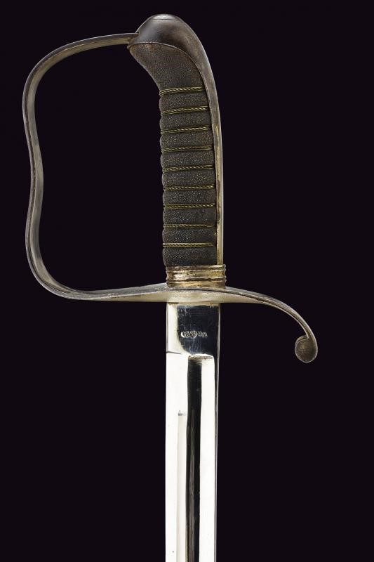 Curved blade with fuller for three quarters of the length on both sides. Tang marked "EISENHAUER" and "W-n 94" with double eagle. Well preserved finishing. Iron hilt with remains of nickel plating. Leather-covered grip with metal wire binding. Iron scabbard with remains of nickel-plating, fixed lug and loop.