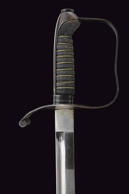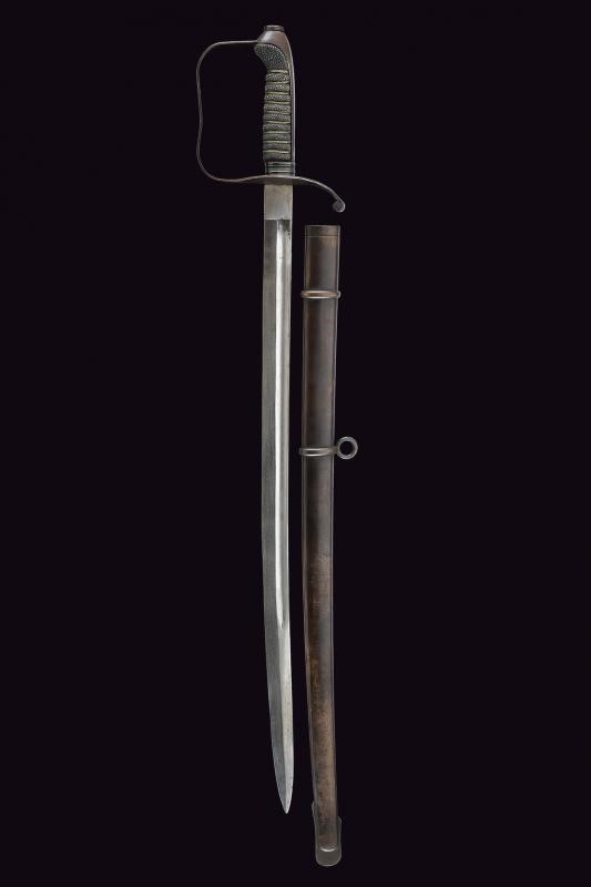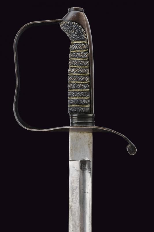 Curved blade with partial fuller on both faces. Iron hilt with remains of browning. Long cap, grip coated with fish-skin with wire binding. Iron scabbard with remains of browning, with one fixed loop and lug.