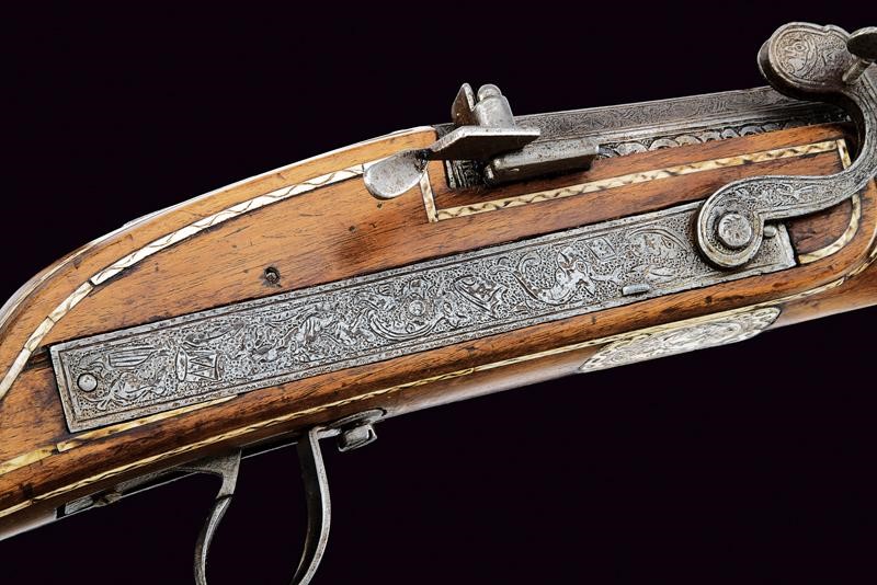 Long, smoothbore, octagonal, 21 mm cal. barrel, the visible part completely engraved with interlaced bands featuring weapons, musical instruments, grotesque animals, all on a granulated background, base with large letter "R" and sight; foresight. On the right side pan with pan cover and spark arrester, rectangular lock engraved en suite but of later date.Full stock of fruit wood decorated with bone plates and strips engraved with helmets and swords (missing parts in the strips and some replacements), fishtail-shaped lock, under the lock there is a bone plate with noble coat of arms featuring a rooster above three stars and below the motto "RESPICE FINEM", the frame of the plate with interlaced bands echoing the barrel decoration. Iron mounts decorated en suite with the barrel. Iron-tipped wooden ramrod.