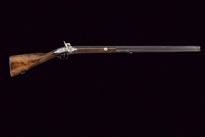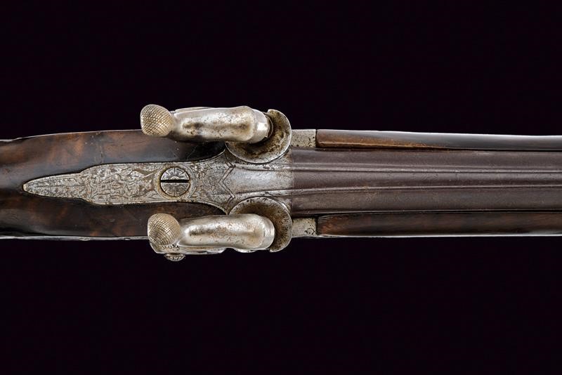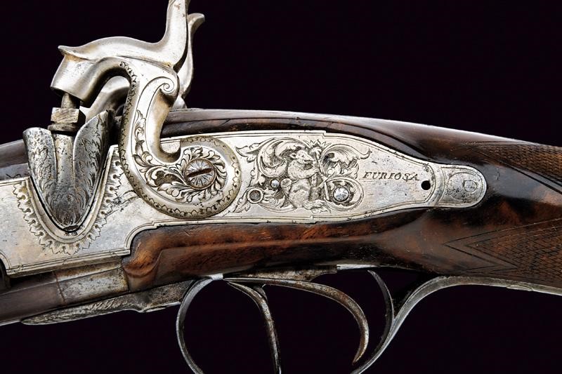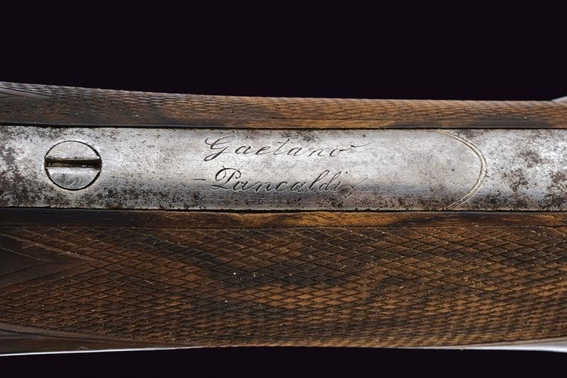 Round, smoothbore barrel with rib provided with foresight, 17 mm cal at the nozzle; dorsal tang engraved with an effigy of a hunter. The barrels finishing possibly refreshed. Long backwards spring locks, marked ‘FURIOSA’ and finely engraved with floral and hunting motifs, signed ‘Gaetano Pancaldi’ inside the plates. Wooden butt and fore-end made of fine briarwood. Iron trigger guard engraved with a trophy and signed ‘Gaetano Pancaldi’ at the base. Under the barrel is a shield with the monogram ‘GM’. Locks and mounts with some pitting. Metal-tipped, wooden ramrod with metal cartridge extractor; the barrel bracket signed ‘Pancaldi’.