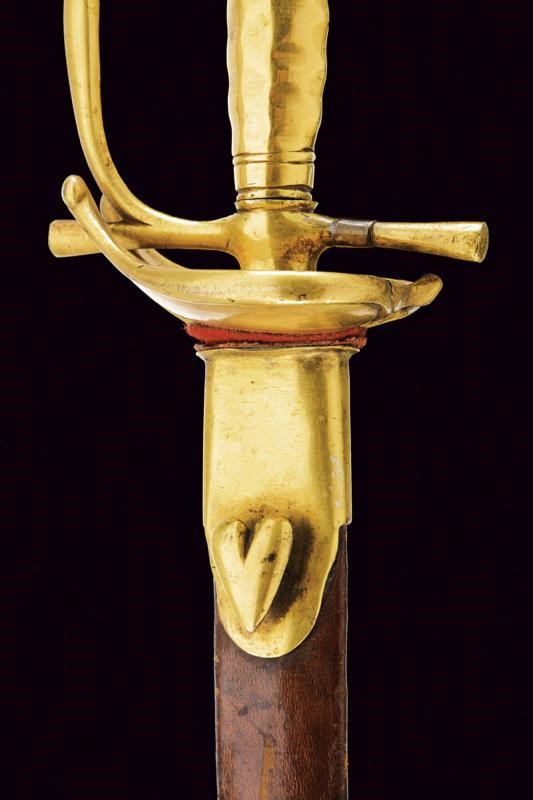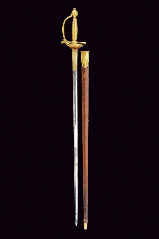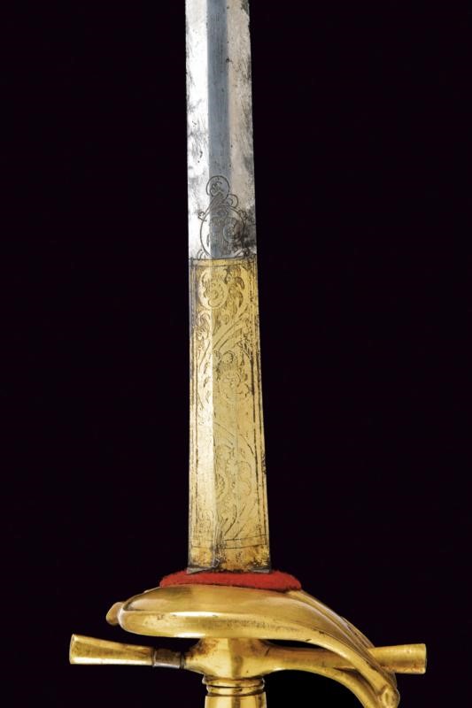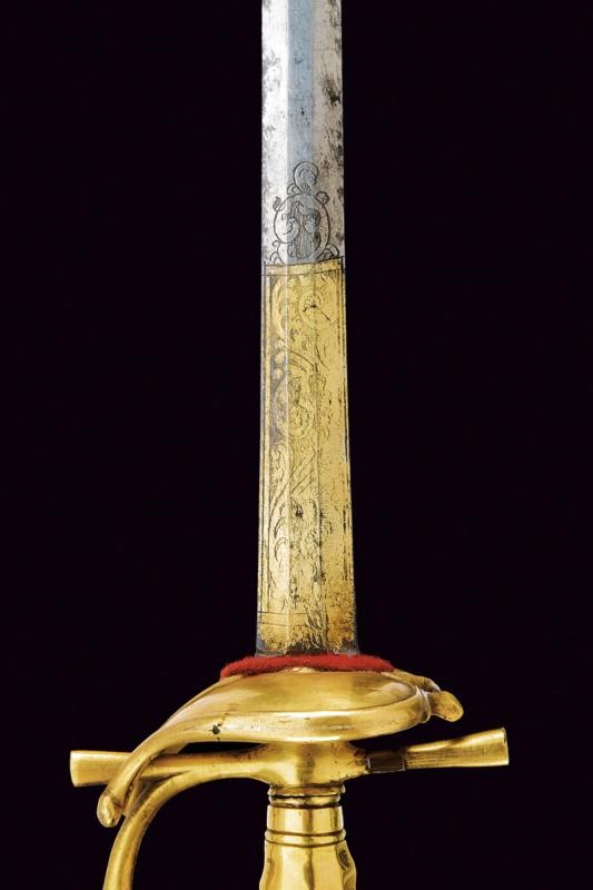 Long, strong, straight blade of hexagonal section, featuring engraved floral motifs with remains of gilding at the forte. Gilt bronze hilt with heart-shaped rain-guard, parry quillon with earlier repair, grip worked with small segments with fuller. Leather scabbard (restored?) with gilded chape and cap. Probably of Maria Theresa of Austria's reign era.