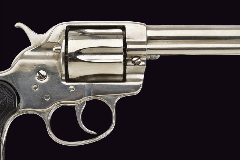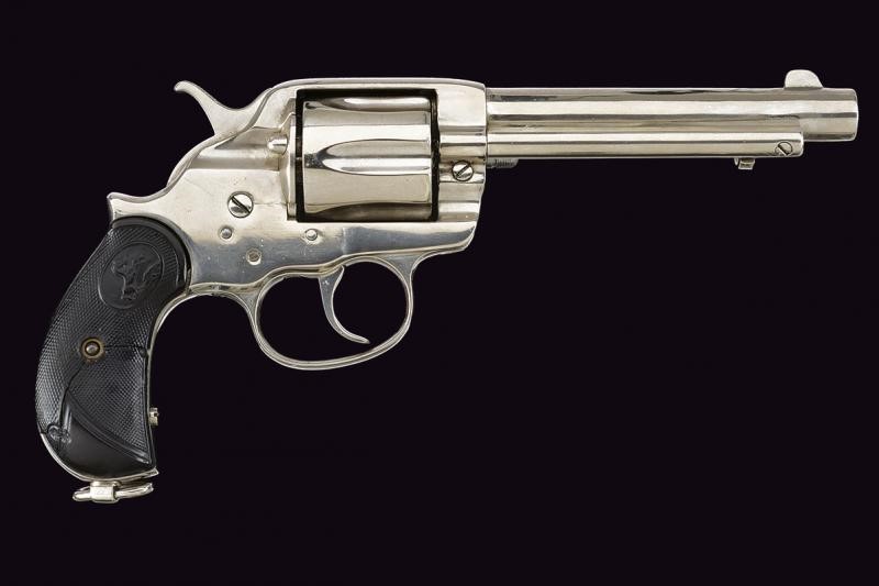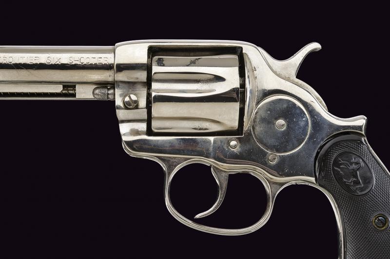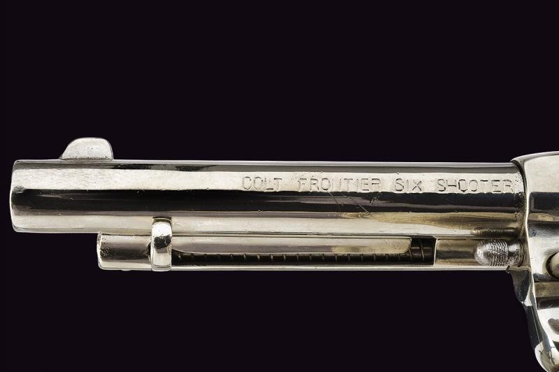 5-1/2" rifled round barrel, with Colt address marking on spine in one line and "COLT FRONTIER SIX SHOOTER" on the side. 44-40 caliber. Clean bore, visible rifling, signs of use inside. Six-shot cylinder. Mechanics in working order but with problems (rotation and cylinder lock). Grip with checkered hard rubber grip-scales and the rampant Colt Pony, one with cracks and small damage. Serial number "37xxx". Nickel-plated finish probably later. Lanyard ring.