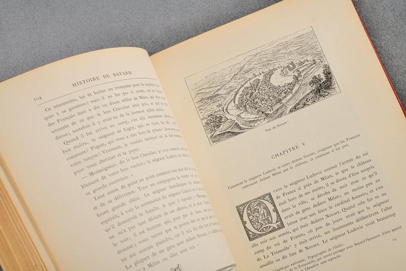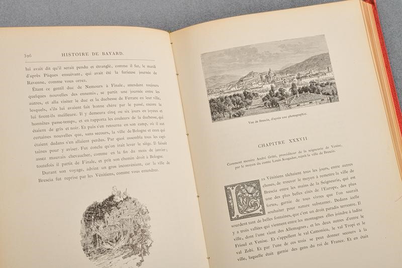 "Le Loyal Serviteur - Histoire de Bayard", Librairie Hachette et C.ie, Paris, 1882. 540 pages with beautiful colour and b/w illustrations, many depicting knights, armour and weapons. In French. Leather hardcover richly decorated in gold and black, gilt cut on all sides. Rare.