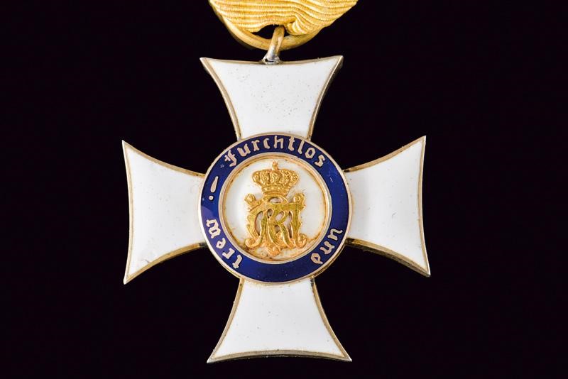 Knight's cross, made of gilded and enameled silver. On original ribbon. One the front quillons, a thin crack.