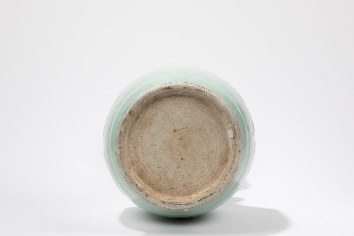 Completely covered with a beautiful pale green glaze, it is decorated on the body with archaic kirin-like motifs, geometric patterns, and clouds; on the neck they are decorated with stylized leaves.