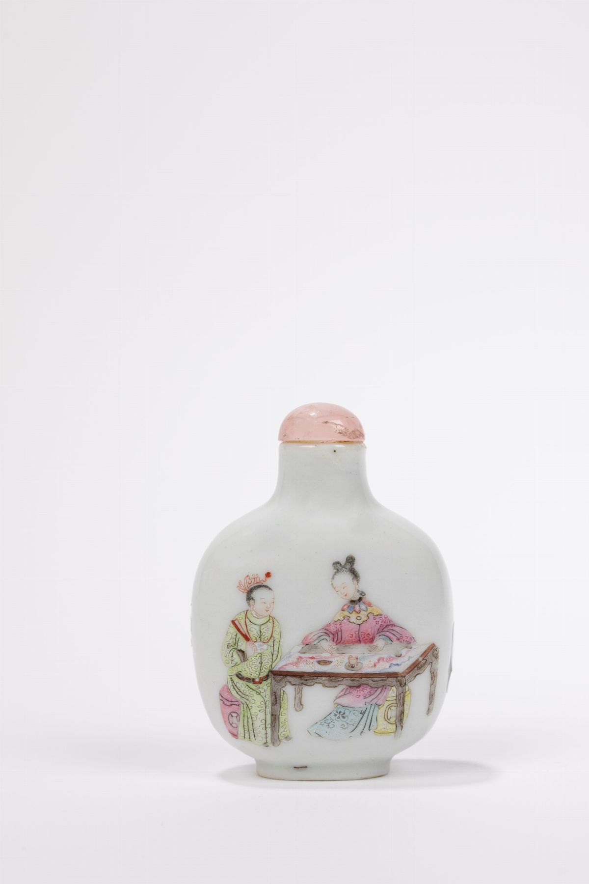 Well painted with a scene of a lady in a room and a scene of a lady sitting at a table with an attendant; in the center of the base bears the mark Yong Le Tang Zhi (拍 品 说 明); the pink quartz cap.