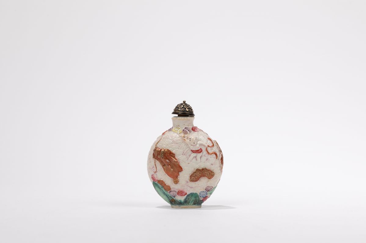 Well moulded with a scene of characters and a dragon among clouds, rocks and waves; on the base it bears the apocryphal seal mark in red of Emperor Qianlong; the metal cap.