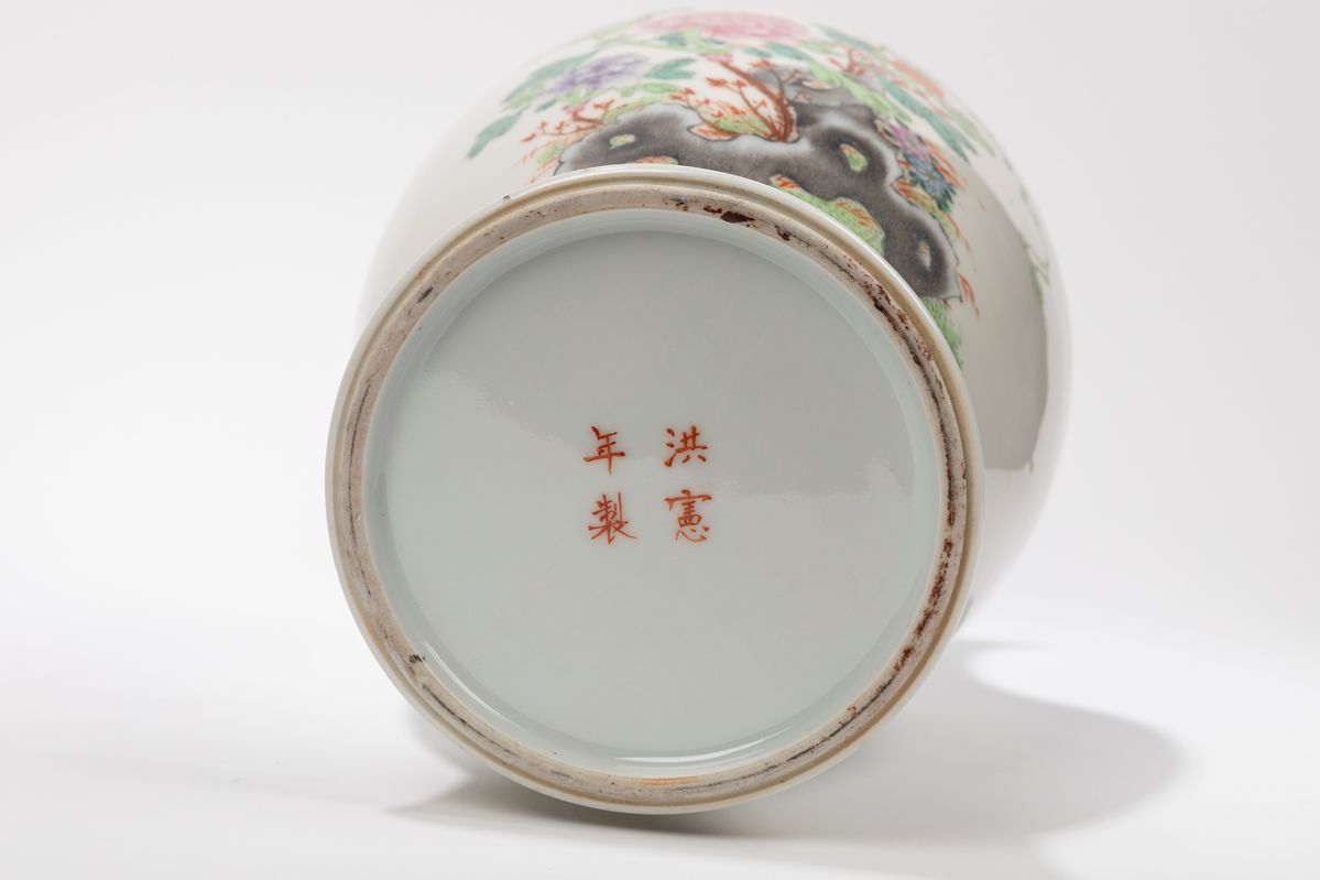 It has a classic baluster column shape, beautifully painted on the body with peonies, a bird and rocks; it bears a four-character Hongxian red mark.