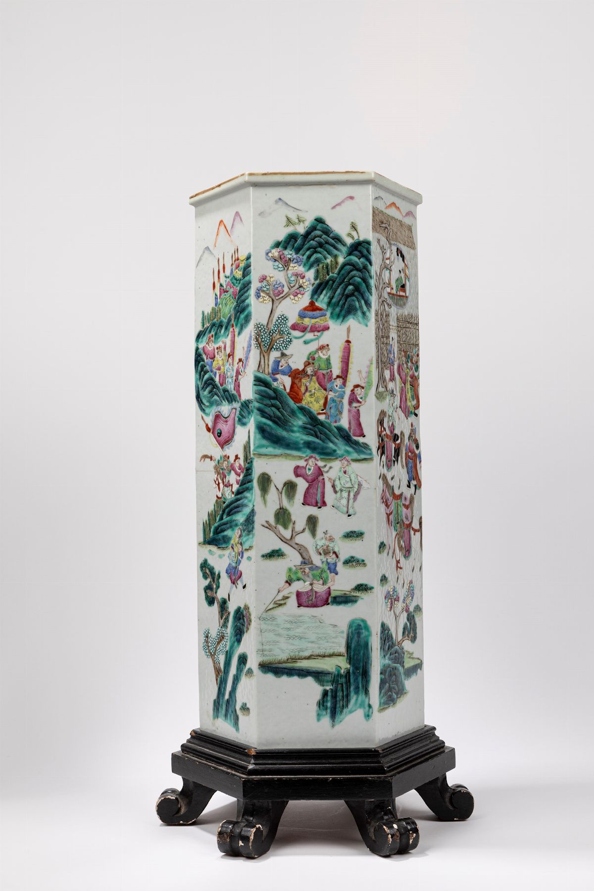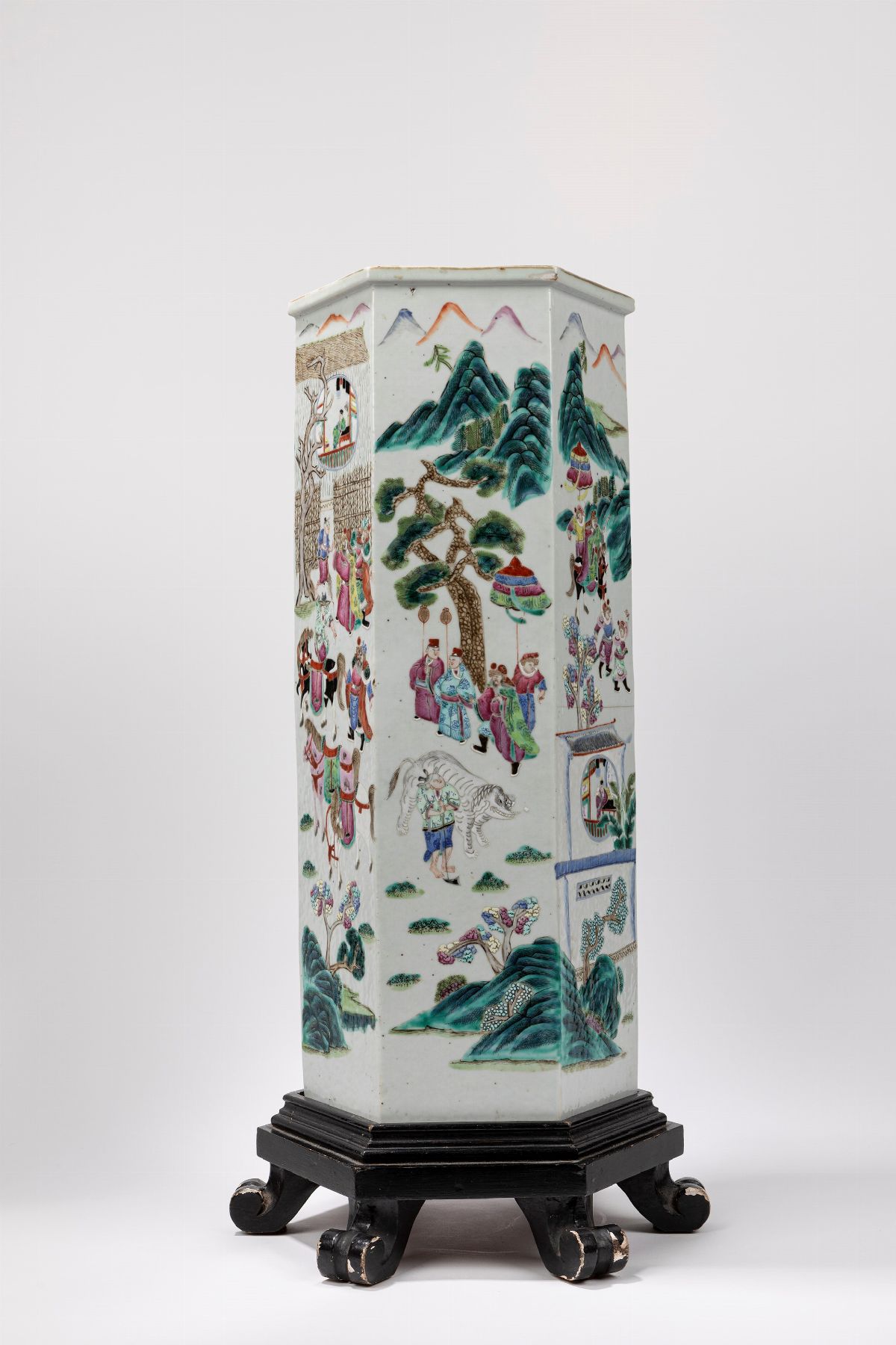 Hexagonal in section, it is painted on each face with scenes of knights, attendants, characters, horses, rocks, trees and mountains; it rests on its wooden base.