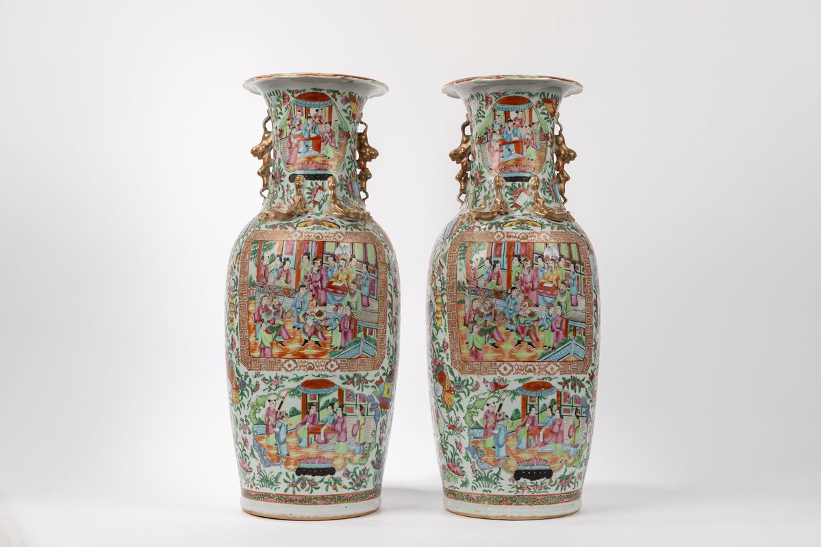 In the shape of a baluster column with lion-shaped handles, they are decorated with the classic Cantonese 'rose medallion' motif in polychrome enamel with characters and flowers.