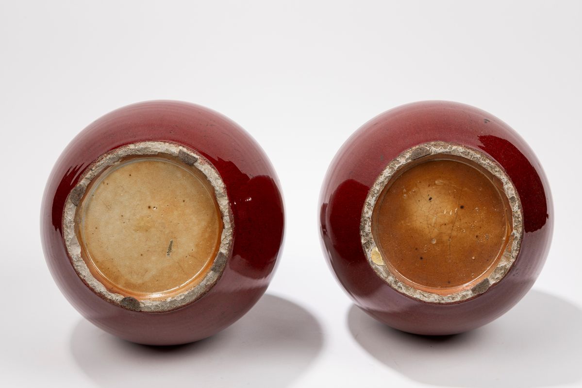 With their classic tianqiuping shape, they are completely covered with a beautiful deep red glaze, which fades to a light celadon colour on the mouth.