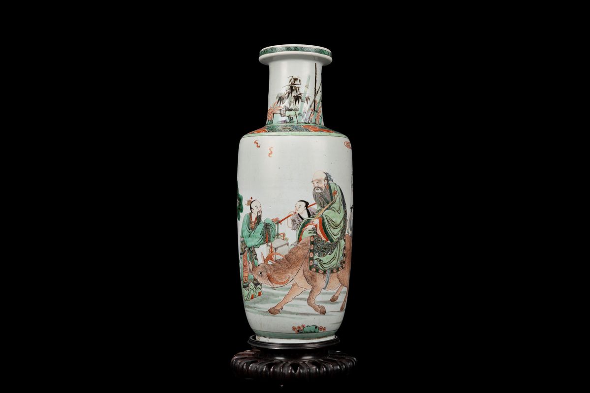 With its classic rouleau shape, it is magnificently painted on the body with a sage riding a buffalo followed by three attendants going to meet a dignitary. The scene, painted with green, yellow, red and bluish-grey enamels, takes place in a beautiful garden under a sky with sun and clouds, among pine trees, bamboo, rocks and bats. The neck, defined by a very fine band decorated with lotus flowers, is spontaneously painted with bamboo and flowers among the rocks.