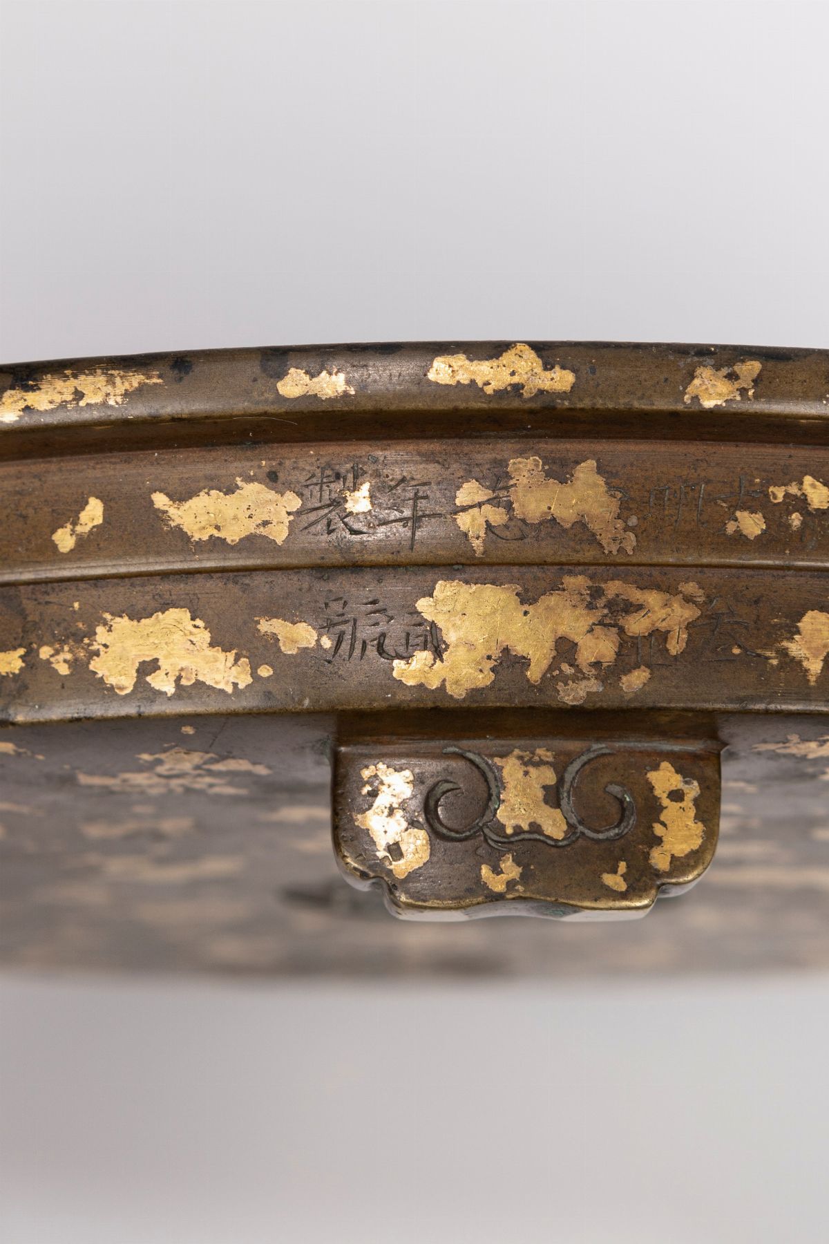 Resting on three ruyi-shaped feet, the short body is finely cast in a band to scale widening upwards from which rises the widest mouth and which falls inward; the whole body is wonderfully decorated with gold spots; at the center of the base bears the apocryphal circular mark of the Emperor Xuande, as well as on the edge is the apocryphal mark engraved with six characters of the Emperor Xuande and a number corresponding to 332 (叁 佰 叁 拾 贰 號), probably an inventory number.