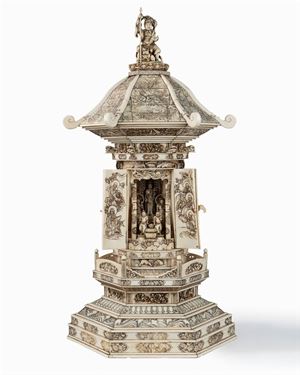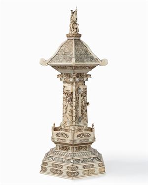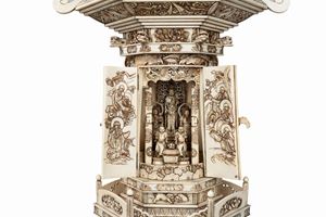 Finemente intagliata alla base con riserve e fiori, sulla parte inferiore una piccola recinzione con shishi e fiori, la parte centrale con figure di saggi buddisti entro un paesaggio con rocce e motivi floreali, contornato da fenici e fiori stilizzati; la parte superiore con un drago tra nuvole; sormontato da un guerriero che sottomette un oni sopra un fiore di loto. Peso: g 19 kg c.
