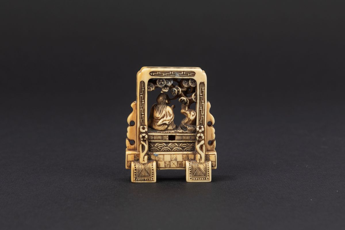 Depicting Tekkai Sennin in a garden as he exhales his soul, in an elegant finely carved frame.