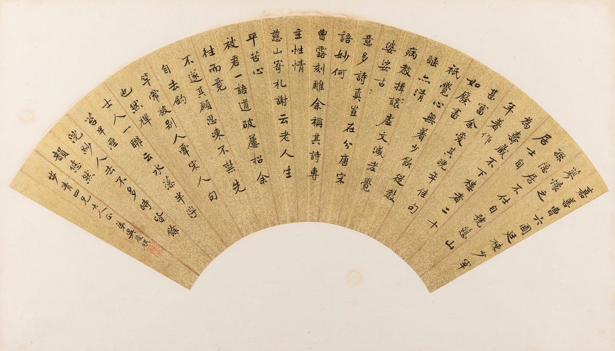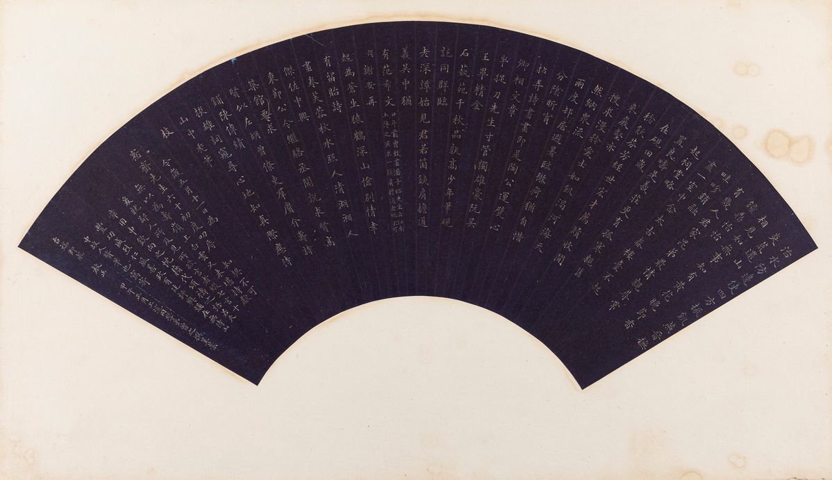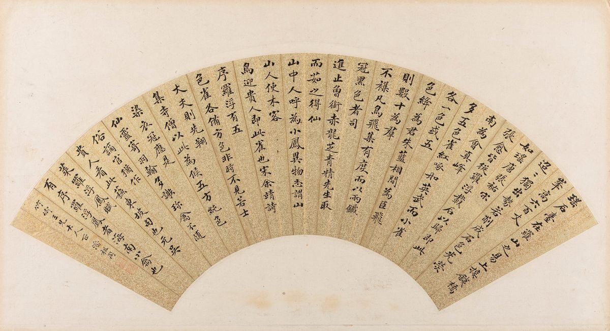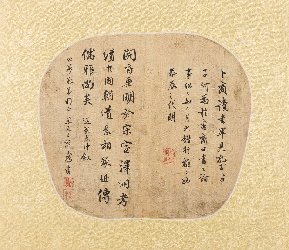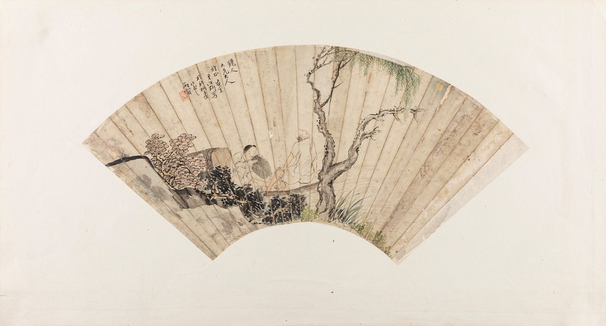 The fans painted respectively with five figures playing in a wooded garden, two figures on a boat in a lake landscape, a smiling figure among rocks, and three with inscriptions; the two painted with calligraphy.