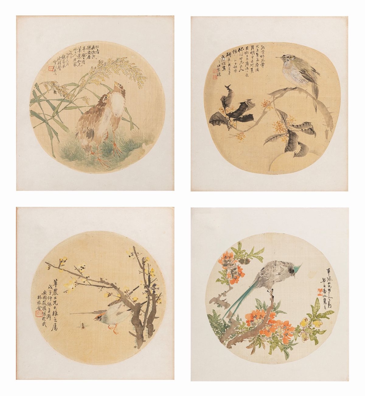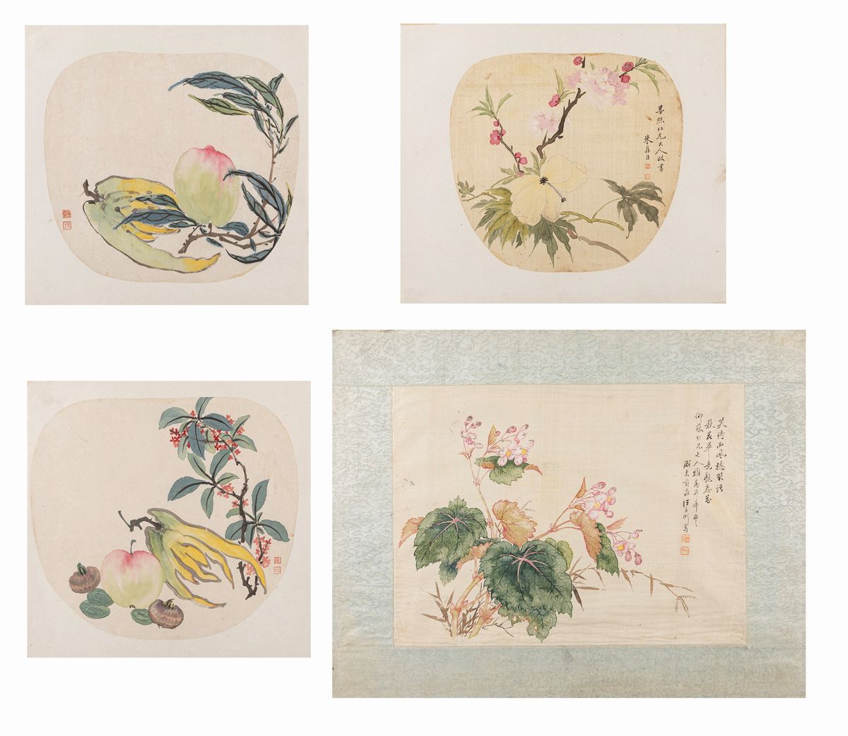 The first depicting birds with inscriptions and floral landscapes; the two on paper with fruits.