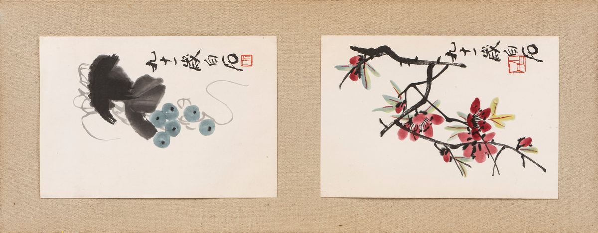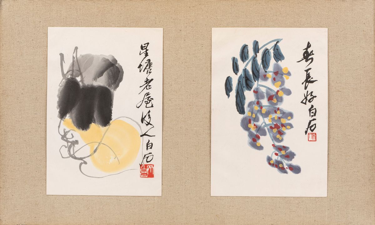 Containing six prints on paper depicting naturalist motifs from famous Qi Baishi models.