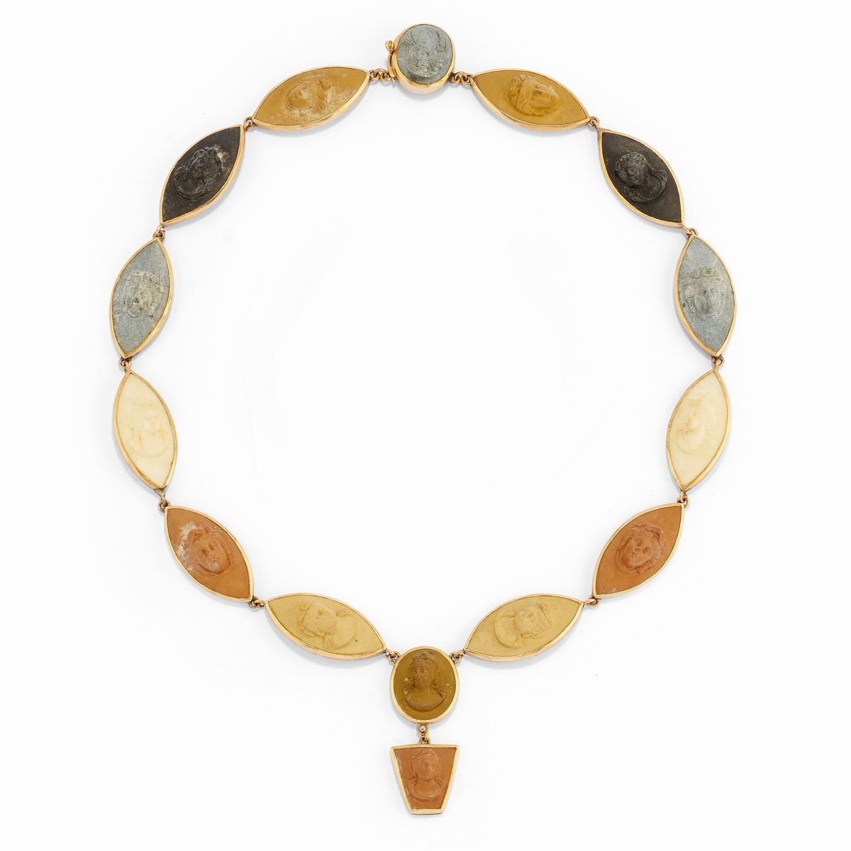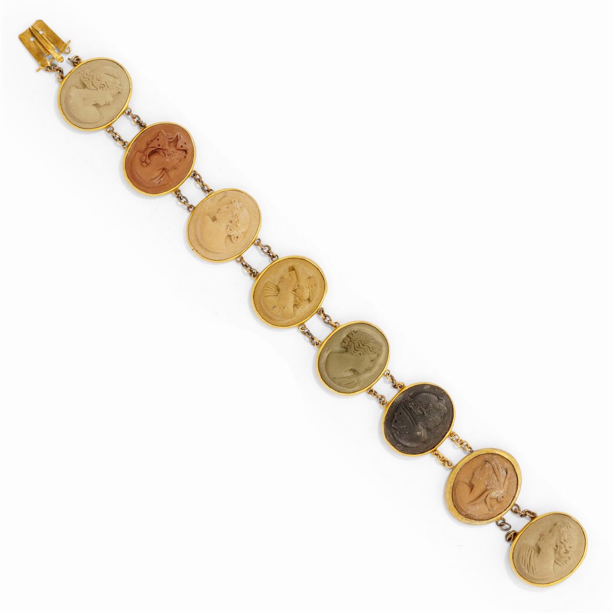 9k yellow goldcrafted with high relief cameos depicting female profiles, defects (several ring joints on the bracelet showing signs of damage).