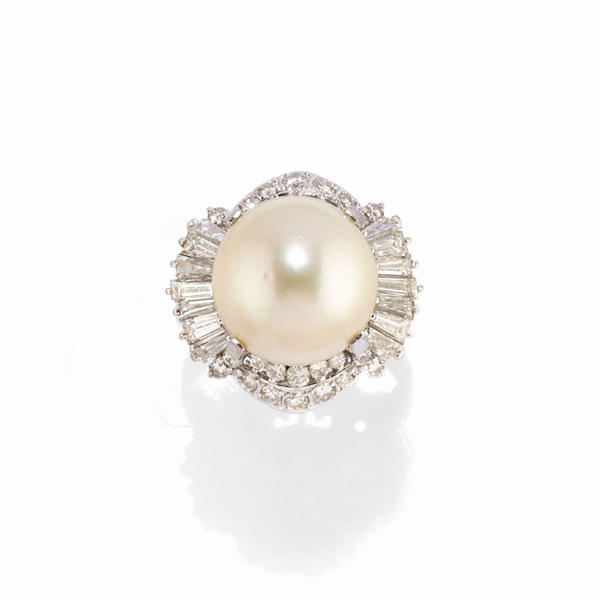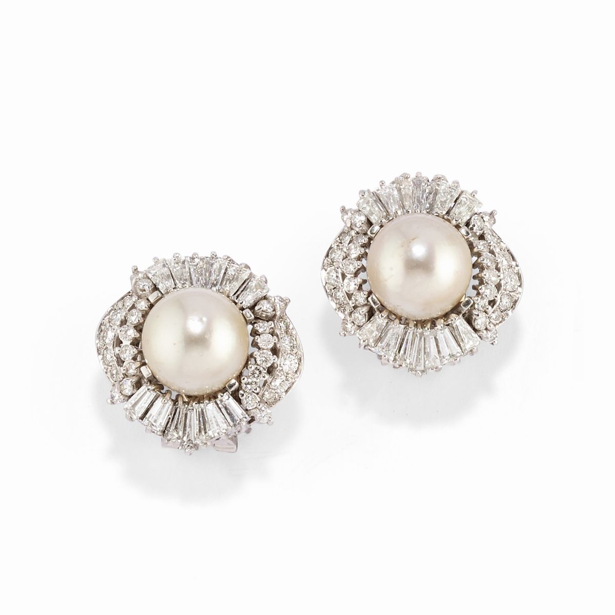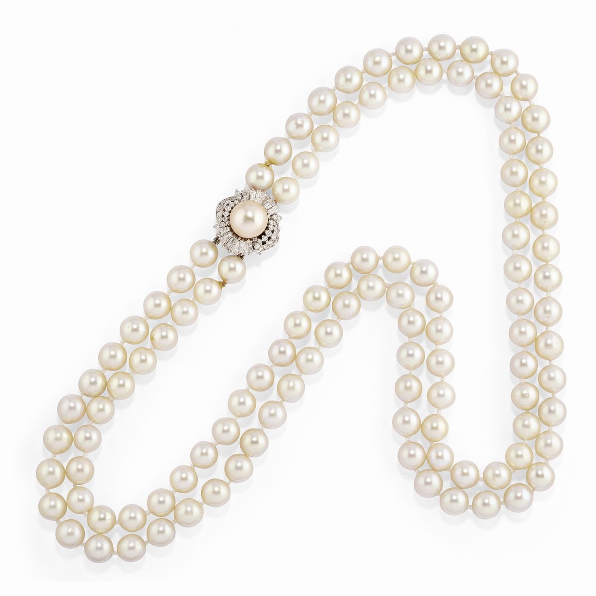 18k white gold and platinumconsisting of a ring, a pair of earrings with a pin, clip, and butterfly clasp, and a two-strand necklace, crafted with cultured pearls from 9.00/15.00 mm, brilliant and tapered baguette cut diamonds totaling approximately 8.00 carats.