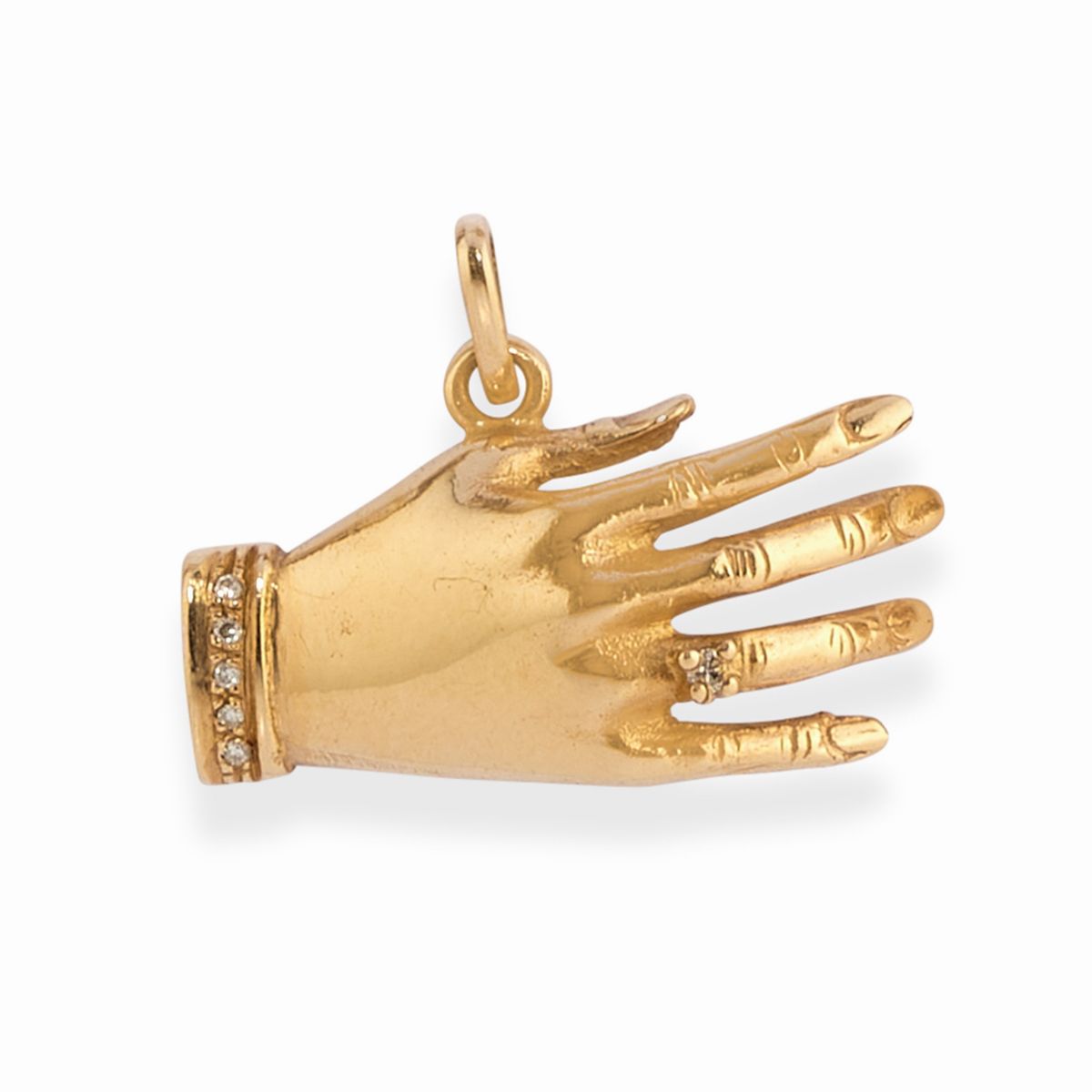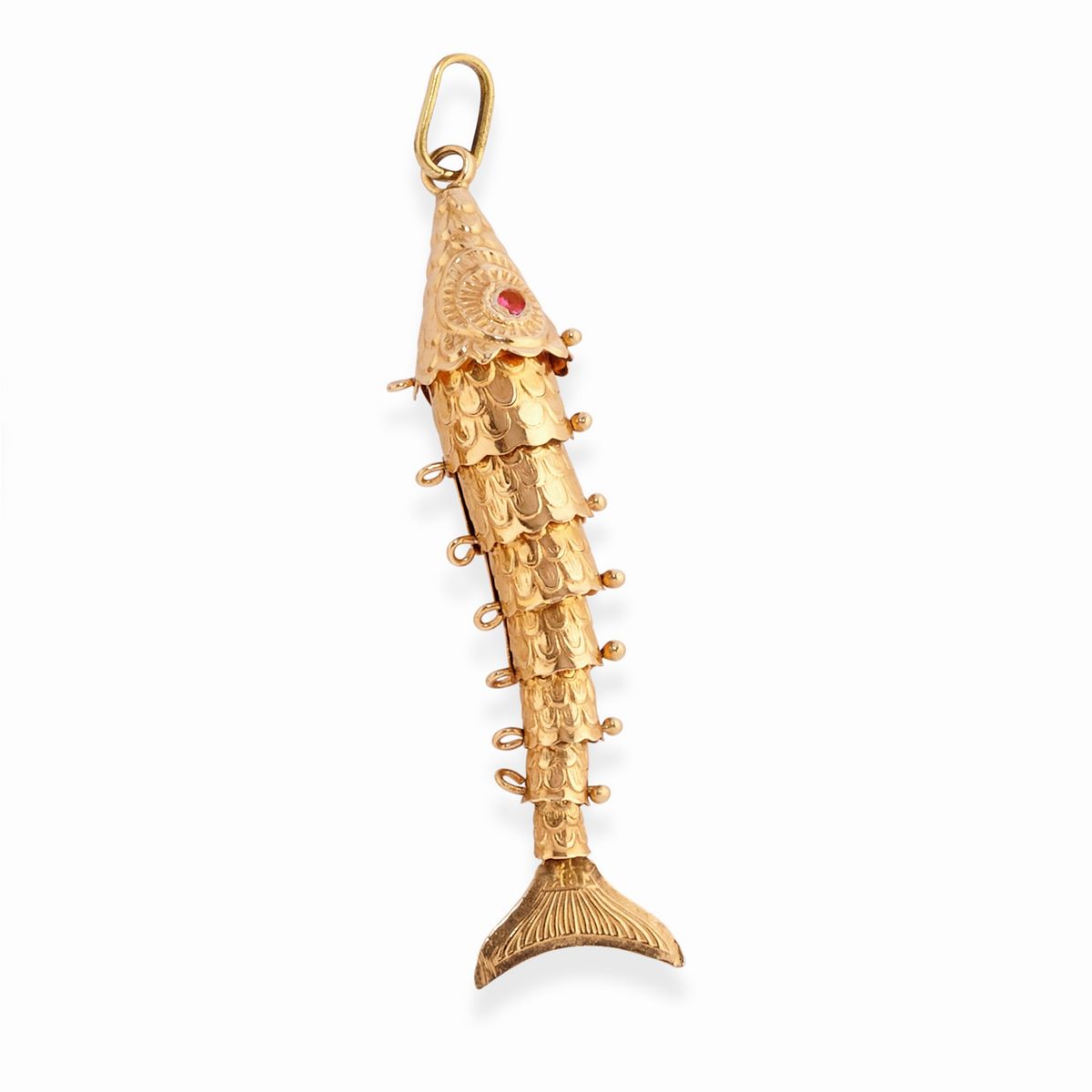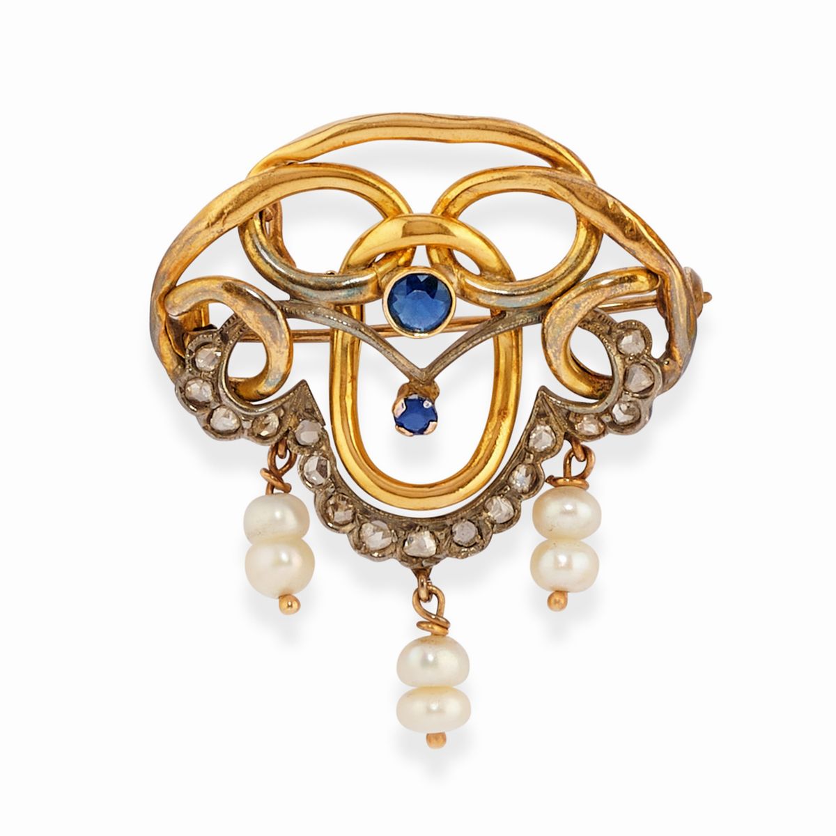 18k, 14k, 9k goldconsisting of four pendants, one brooch, a pair of earrings, and a money clip, in various shapes and depictions, with decorations in diamonds, pearls, and colorated stones.