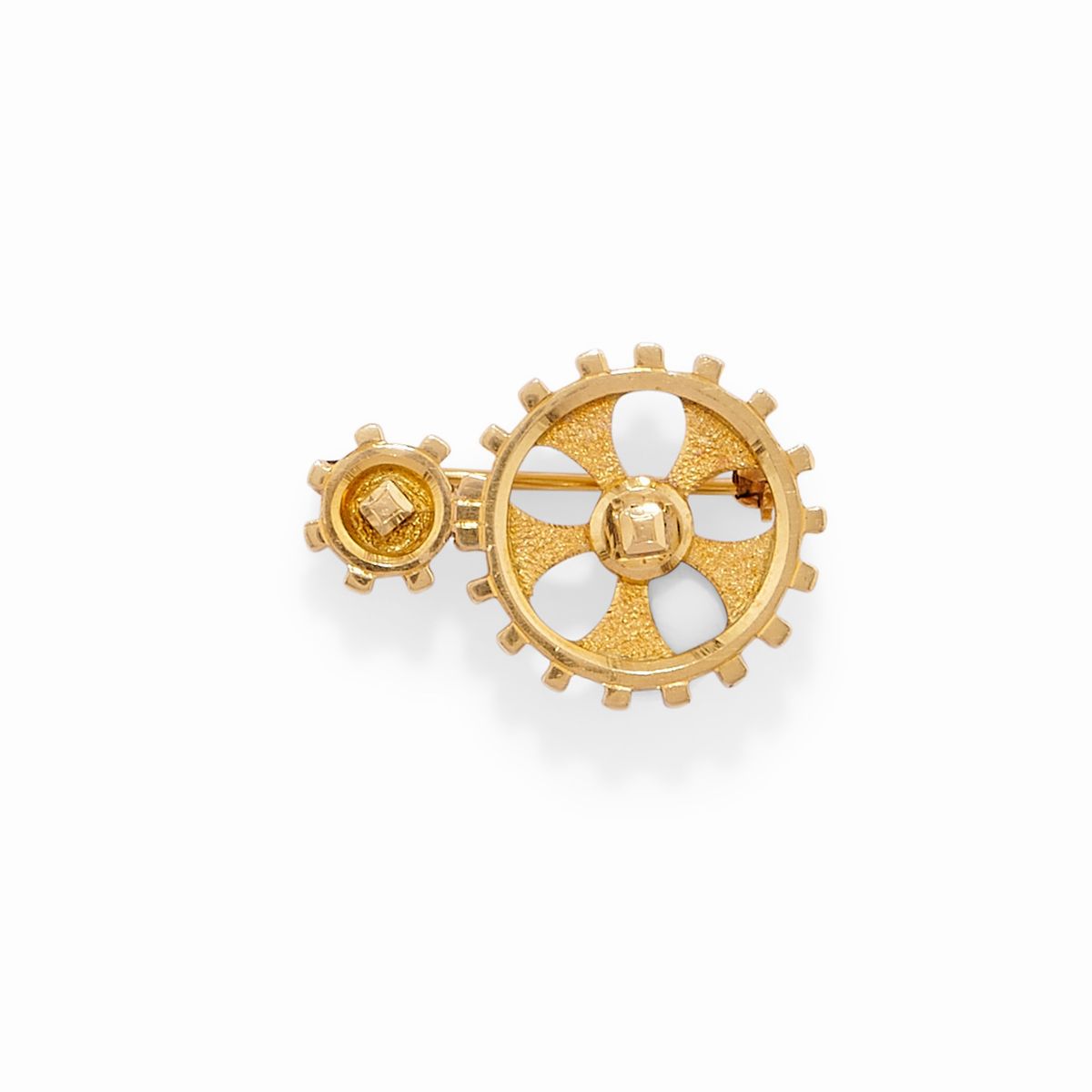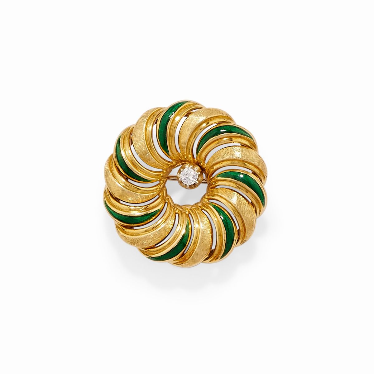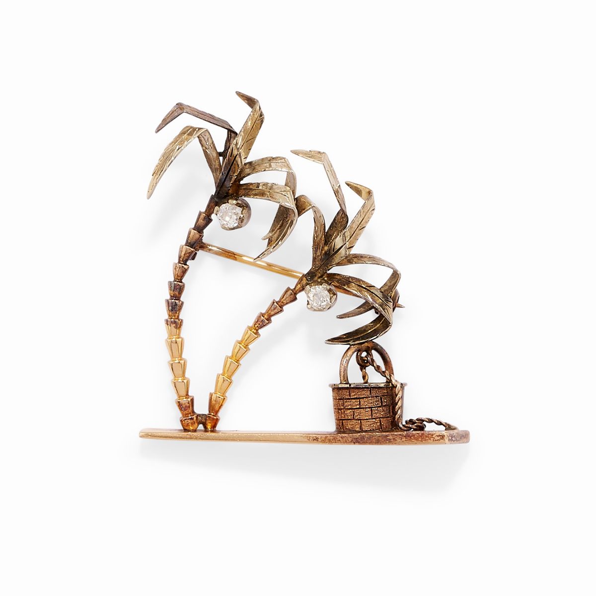 one with palm trees adorned with two old cut diamonds, one wheel-shaped and one radiating with green enamel decoration and a small brilliant cut diamond.
